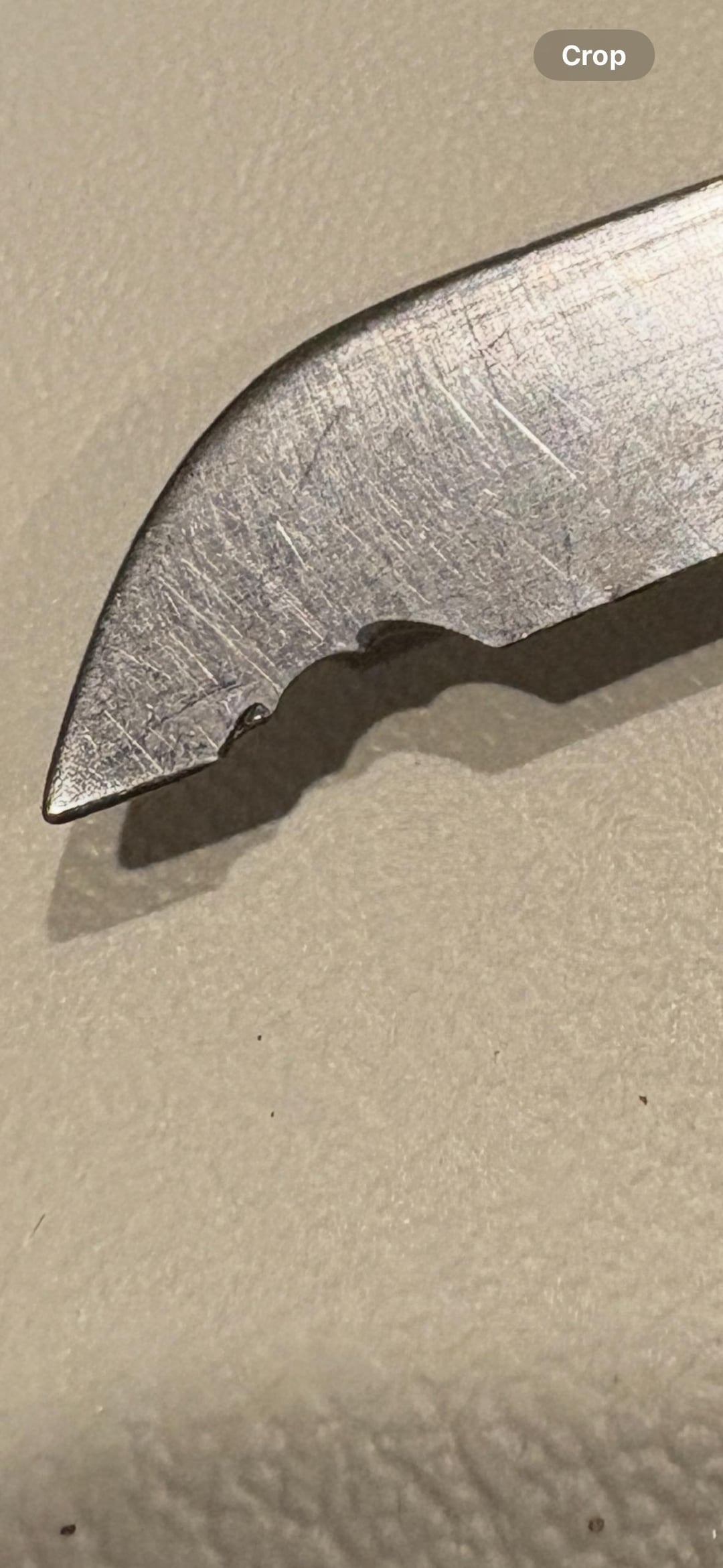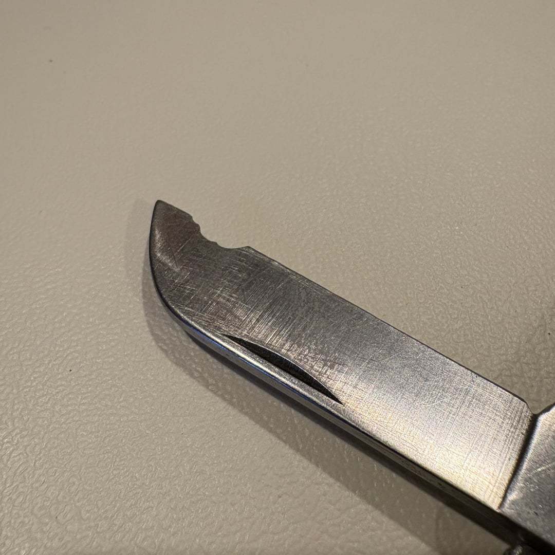 Found this 307 Buck in my dad’s shop. Is this shape intentional, or is it a chip? It just seems shaped too pleasantly to be a chip. Maybe it’s from someone trying to open a bottle with it?