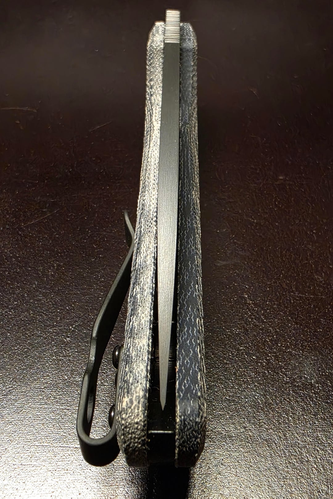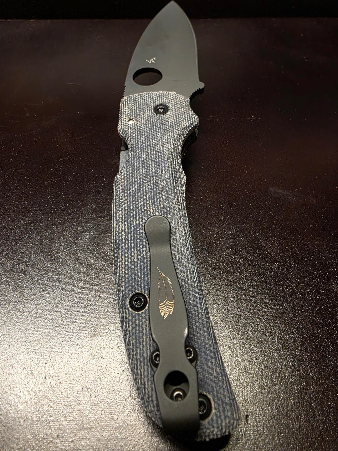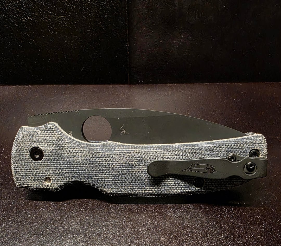 AWT Cobalt Canvas Micarta skinny scales. And a feathered Lynch clip.