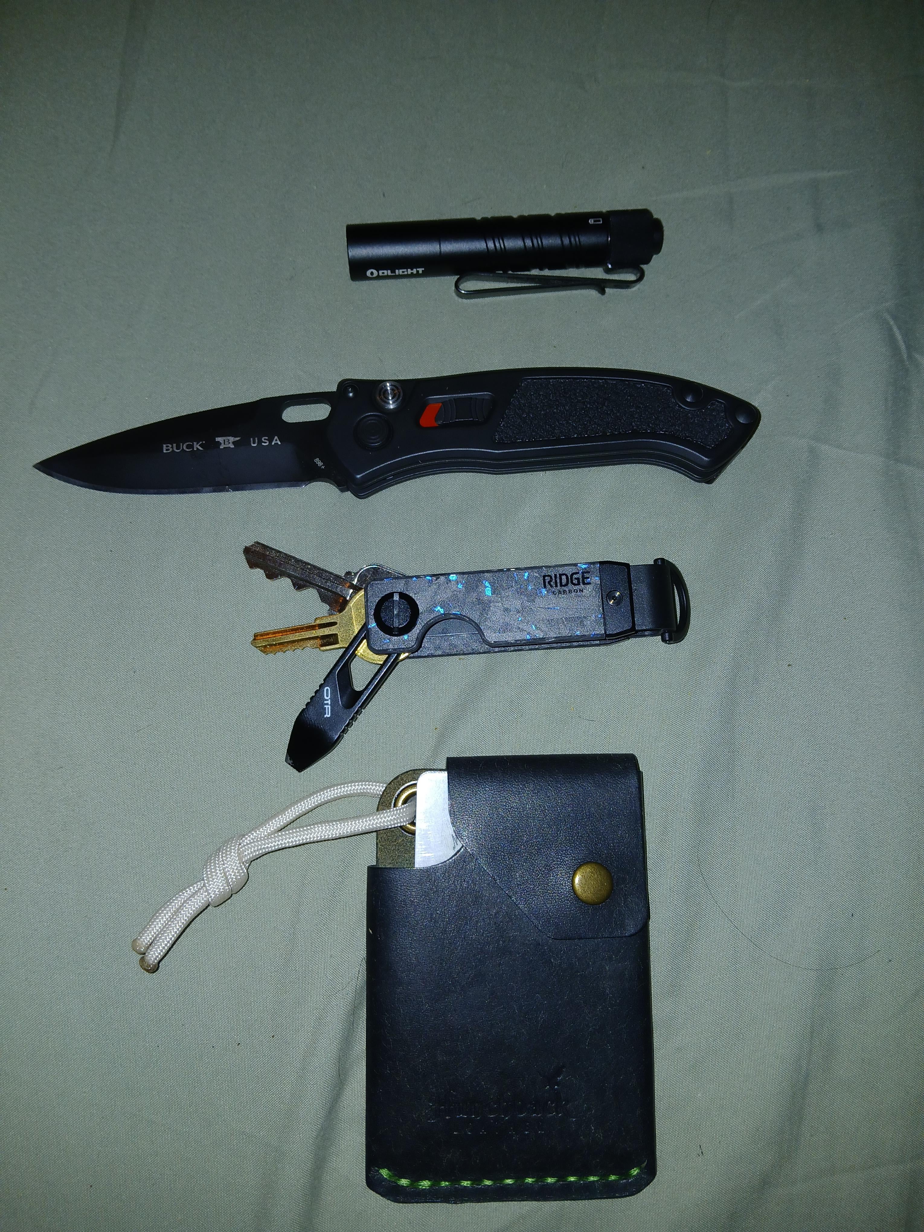 O light I3T, Buck Impact Auto, Ridge Key Holder, and Hunchback Leather wallet
