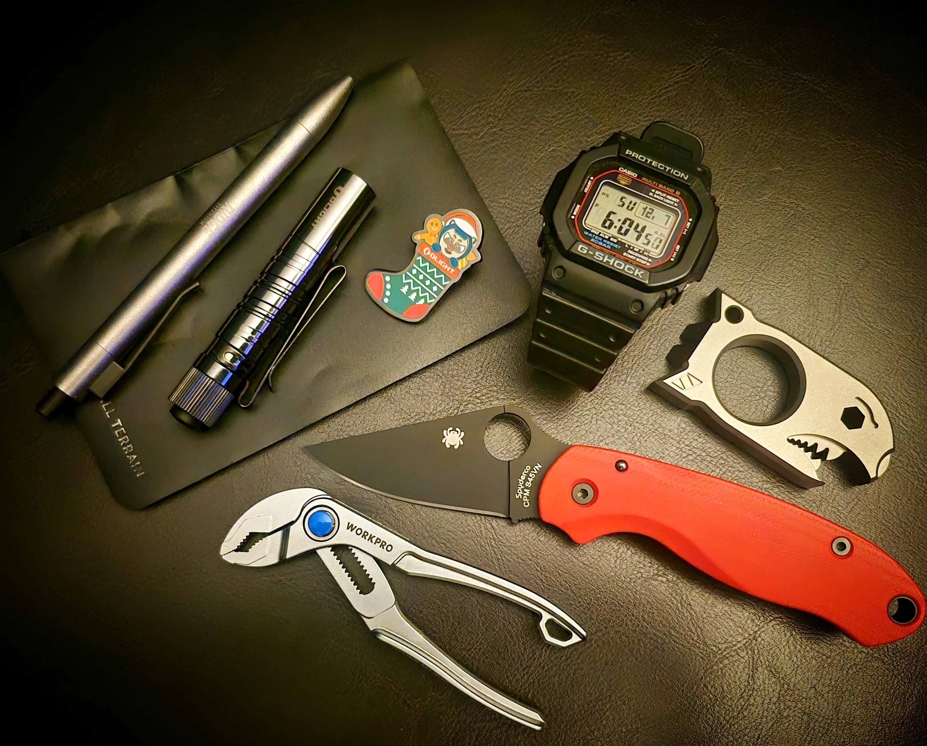 In EDC Behold the reason my pockets jingle like a toolbox. December 7, 2025 Left to Right:Ridge quiet click Titanium pen.Olight i3t Eos Zirconium.Olight holiday pin.All terrain note book.WORKPRO pliers 4in.Spyderco Para 3 Flytanium mod.Gshock GWM5610. NotoriousEdc Beer bomb bottle opener.by Broteinpoder EDC Prev Post New Quiet Carry Drift C! Black or grey? December 7, 2025 Next Post Carpet UV December 7, 2025 Related Posts Titanium in my pocketses January 16, 2026 Leather sheath for the Soddy January 16, 2026 Today’s Blade: Tom Krein Alpha #NKD January 16, 2026 1 Comment AutoModerator 1 month ago Thank you for posting to r/EDC! Include a detailed item list (make/model) within **1 hour** of submission. Lists can go in the title, a comment, or the image. Posts without lists will be removed. If you have already provided a list, not further action is needed, thanks | [FAQ](https://www.reddit.com/r/EDC/wiki/faq)*I am a bot, and this action was performed automatically. Please [contact the moderators of this subreddit](/message/compose/?to=/r/EDC) if you have any questions or concerns.*Write A CommentYou must be logged in to post a comment.