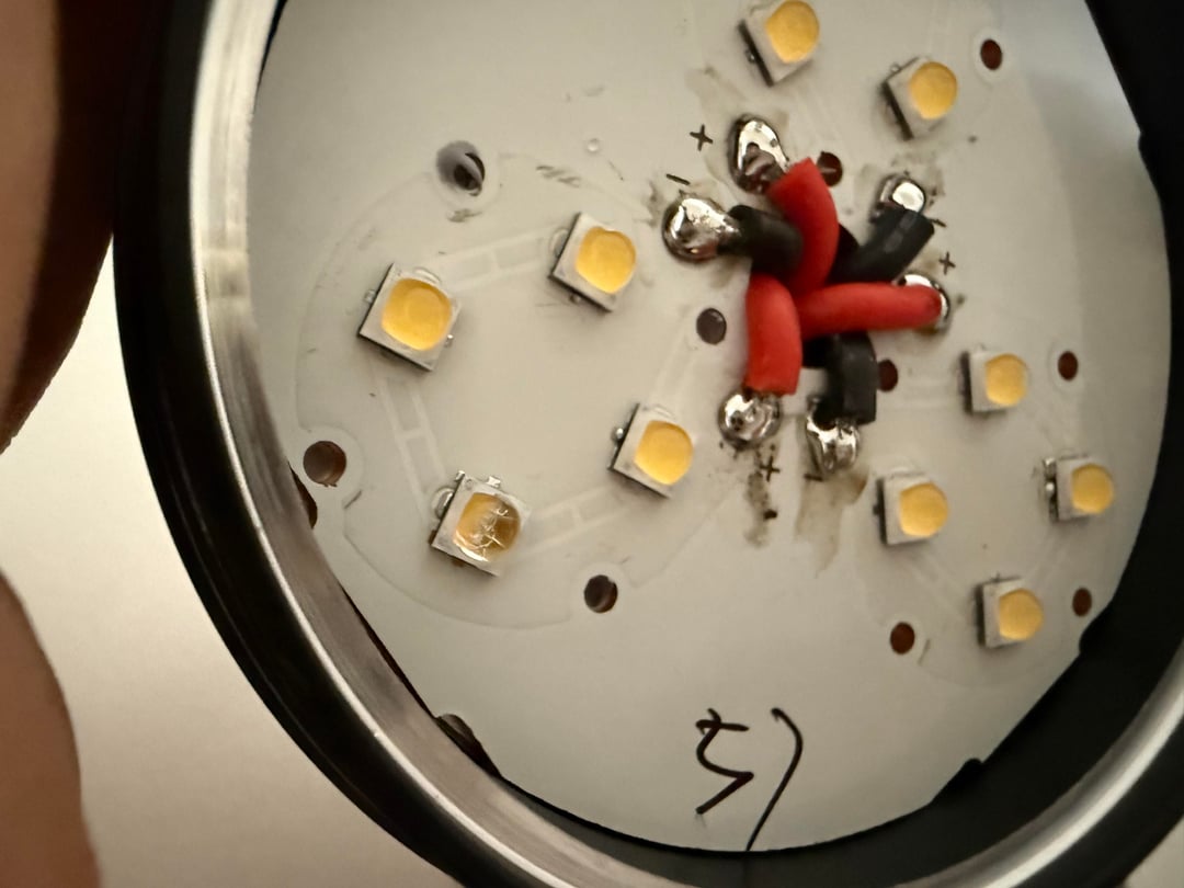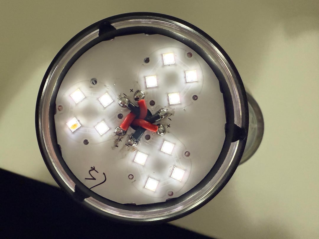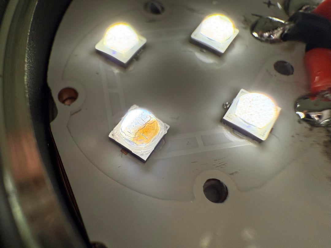 Today, I received my Convoy 3x21E (519A, 5700K). I put in my EVE 50E cells and I turned it on, and I observed that one of the emitters was a little darker than the others on moonlight. Upon removing the lens, I see that one of the emitters seems to be damaged. What could've caused this? Is it still safe to operate?