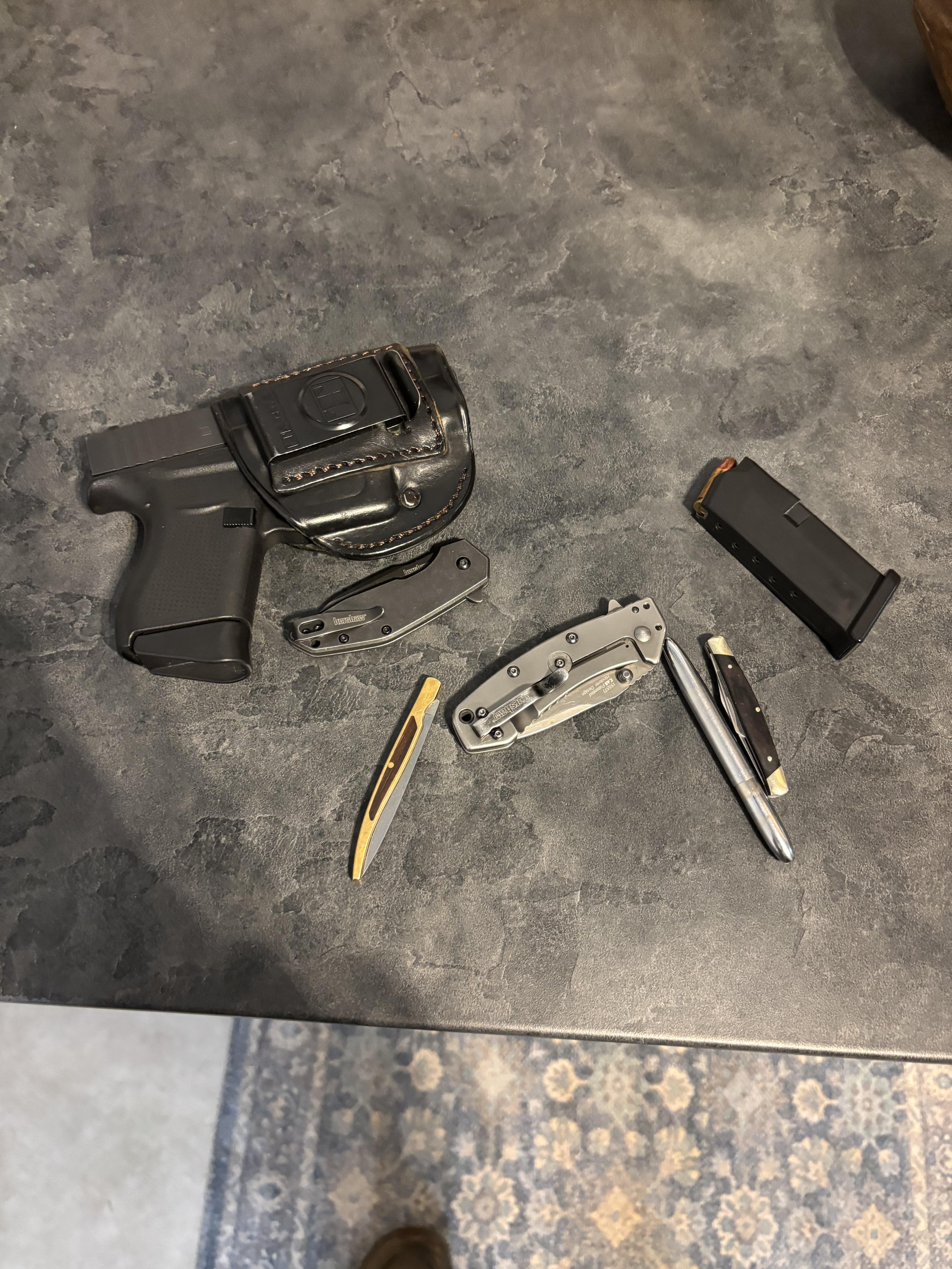 In EDC Sunday pocket dump December 8, 2025 Glock 43 , fisher pen, Kershaw assist x2 buck and ICEL stilettoby jandrgarage EDC Prev Post Smooth AF Benchmade 940 December 8, 2025 Next Post latest 👌🏼 December 8, 2025 Related Posts Actual EDC and slightly extended EDC January 15, 2026 Cheap off day EDC January 15, 2026 3rd Shifter January 15, 2026 1 Comment AutoModerator 1 month ago Thank you for posting to r/EDC! Include a detailed item list (make/model) within **1 hour** of submission. Lists can go in the title, a comment, or the image. Posts without lists will be removed. If you have already provided a list, not further action is needed, thanks | [FAQ](https://www.reddit.com/r/EDC/wiki/faq)*I am a bot, and this action was performed automatically. Please [contact the moderators of this subreddit](/message/compose/?to=/r/EDC) if you have any questions or concerns.*Write A CommentYou must be logged in to post a comment.