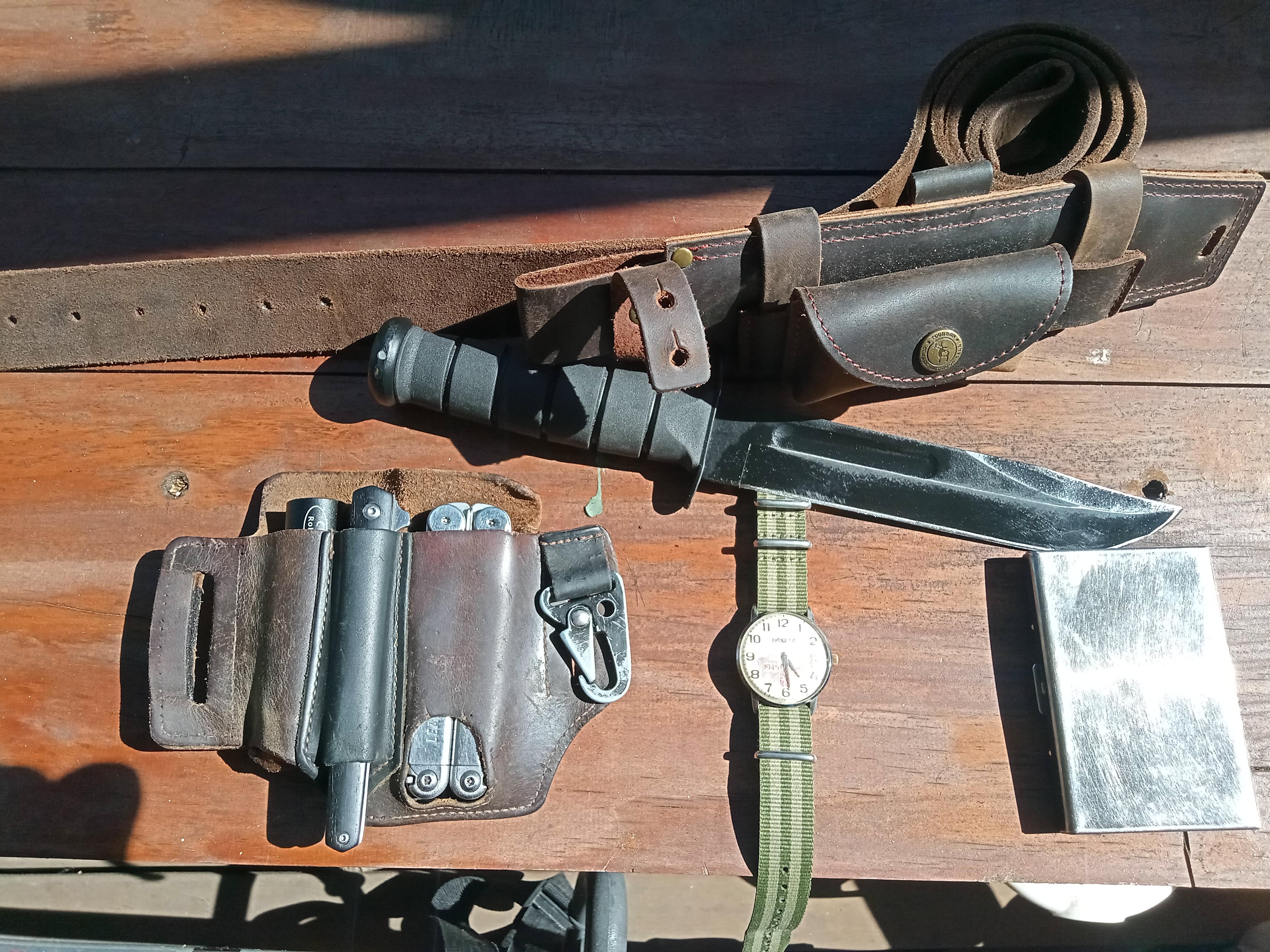 It’s a Leatherman Wave+, Kabar with the ceramic coating that has barely survived 1 year of cutting fiberglass hay bales apart (wouldn’t recommend), $5 Aliexpress pen knife, generic $3 AA battery torch, ~40yo soviet mechanical watch and another cheap Aliexpress aluminium wallet that holds my bank cards and car/truck/motorbike/plane/helicopter licences