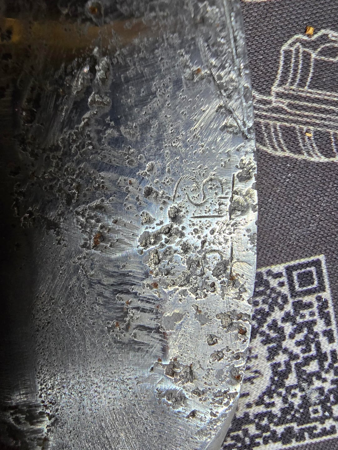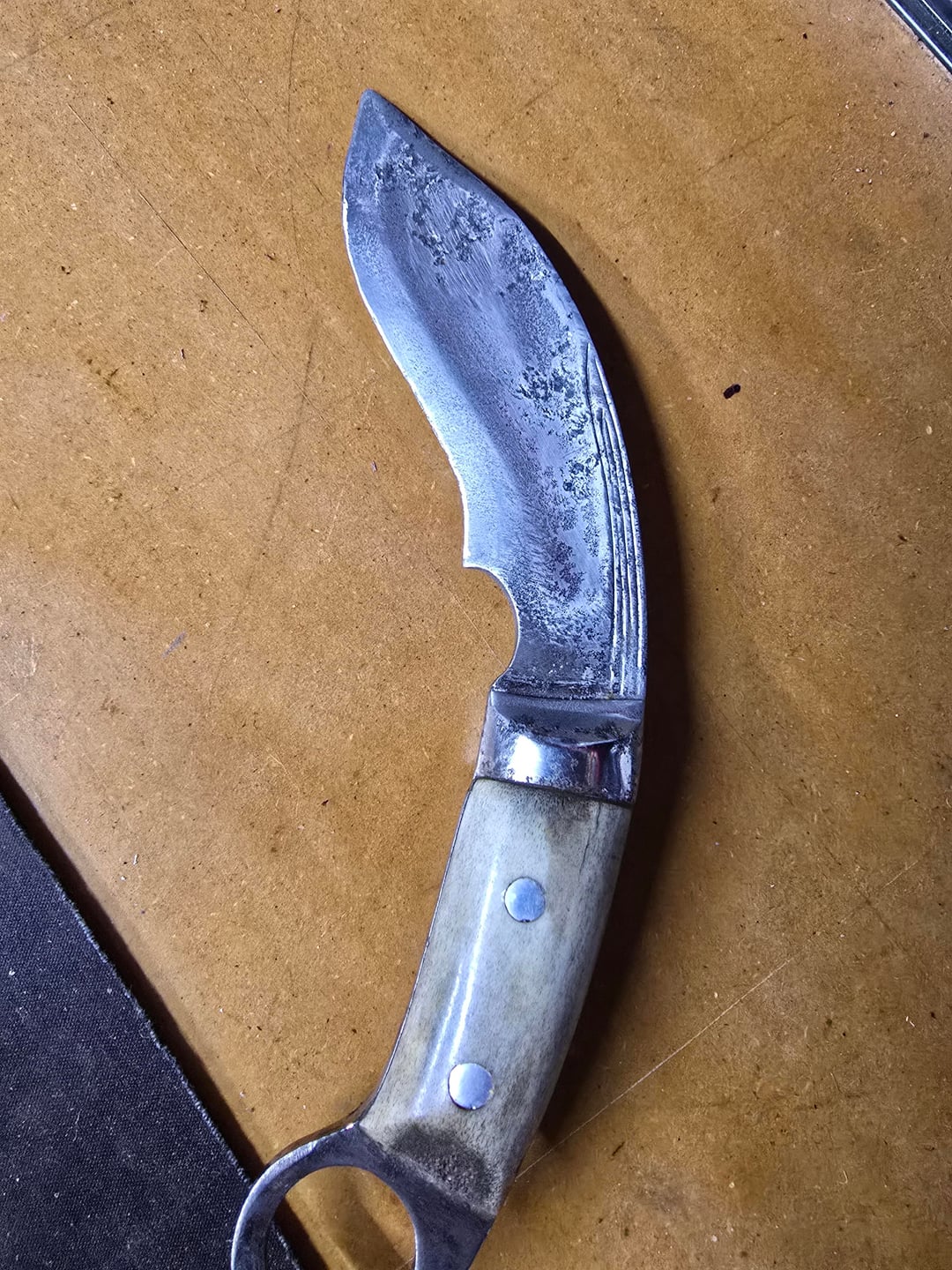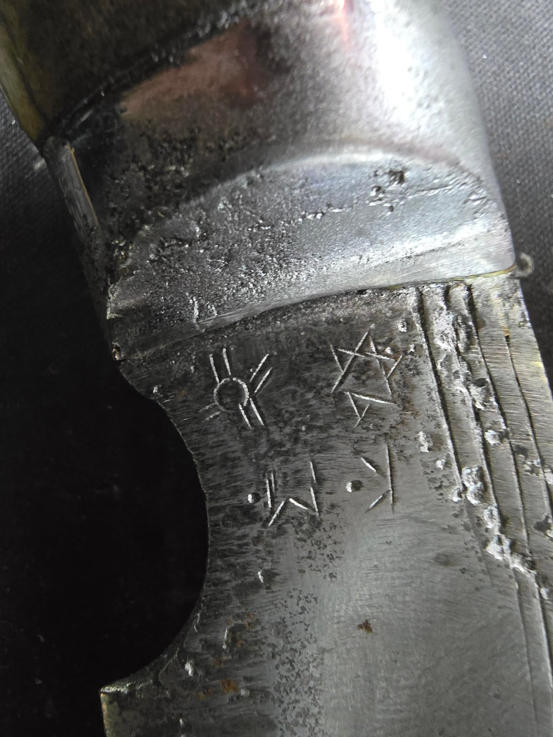 Himalayan Imports Kerambit. Badly pitted from the look of it. Those markings are from the smith who made it.
