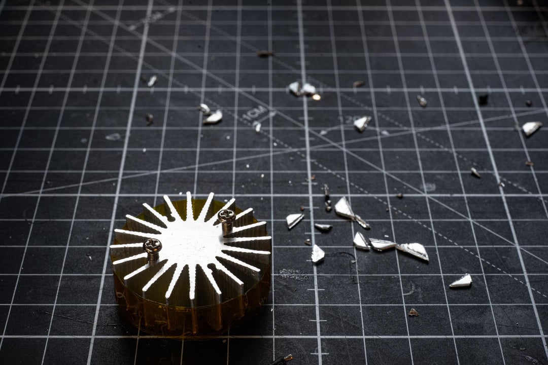 On top of the driver assembly there's a aluminuminum heatsink that has been modified to press fit, no glue used. Some kapton tape was added to give a bit of insulation against the plastic host to keep it from melting into a puddle of unicorn goo.