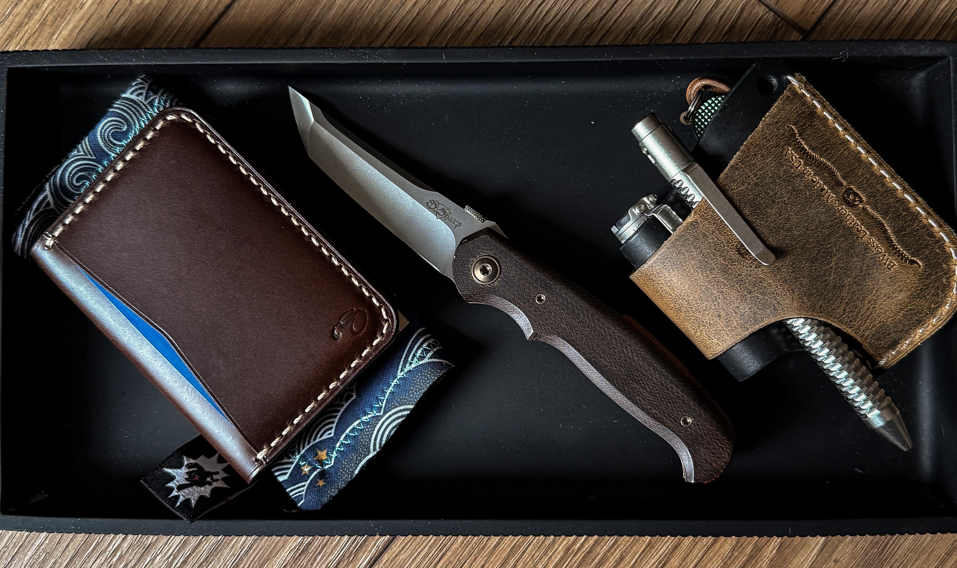Buttero wallet from Eric S Pocket Hank with microsuede David Sharp mini l&l Bweiss carry all with a Nottingham carved pen, Muyshondt aeon mk3 and a cadet.