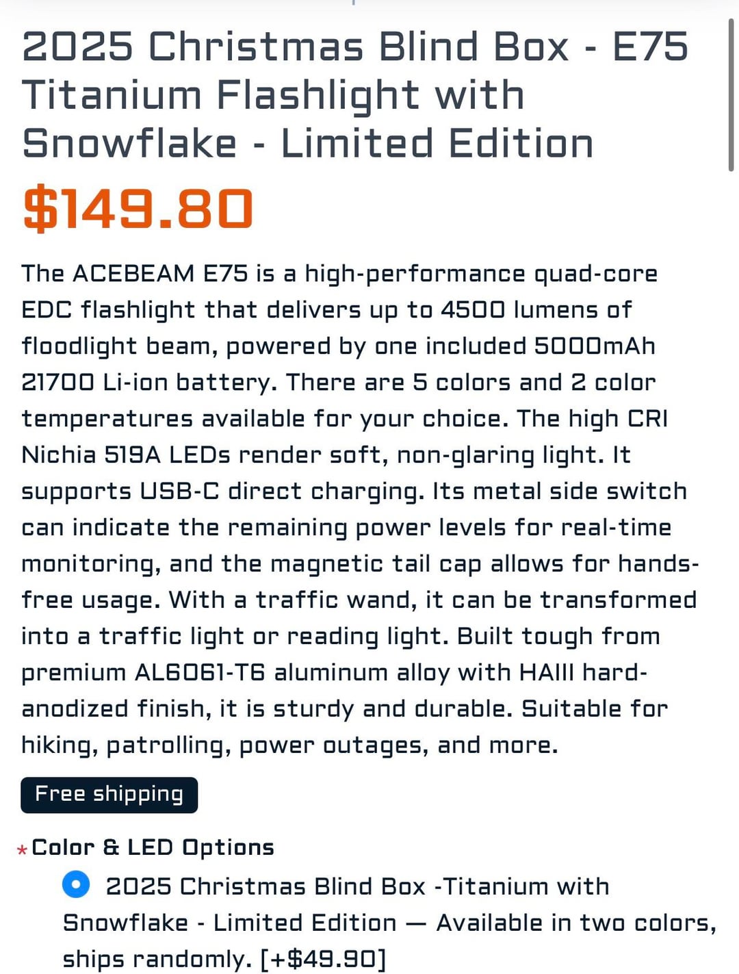 In Flashlight Just as I’ve been thinking about getting an E75, Acebeam announces these Titanium beauties December 9, 2025 Does by H_noots flashFlashlightlight Prev Post Been a minute since I carried a Hinderer. December 9, 2025 Next Post I used to think anyone who cut themselves on NKD was a fool until I became one today. Anyway here’s today’s carry. December 9, 2025 Related Posts Color comparison: e17a 1850, NTG50 1800k, e21a 2000k; 519a 2700k January 16, 2026 What am I doing wrong? January 16, 2026 New torch on my keys, might have mismeasured slightly. January 16, 2026 1 Comment macomako 1 month ago Thanks for sharing.I wonder about the thermal performance. The Alu version gets pretty hot on High/Turbo but maintains the brightness impressively well:https://preview.redd.it/8mhn5s9nb96g1.jpeg?width=1440&format=pjpg&auto=webp&s=b47d2830f365563e817674b6fa92fce9a3e3d402Source: [https://tgreviews.com/2023/08/12/acebeam-e75-519a/#runtime](https://tgreviews.com/2023/08/12/acebeam-e75-519a/#runtime)Write A CommentYou must be logged in to post a comment.