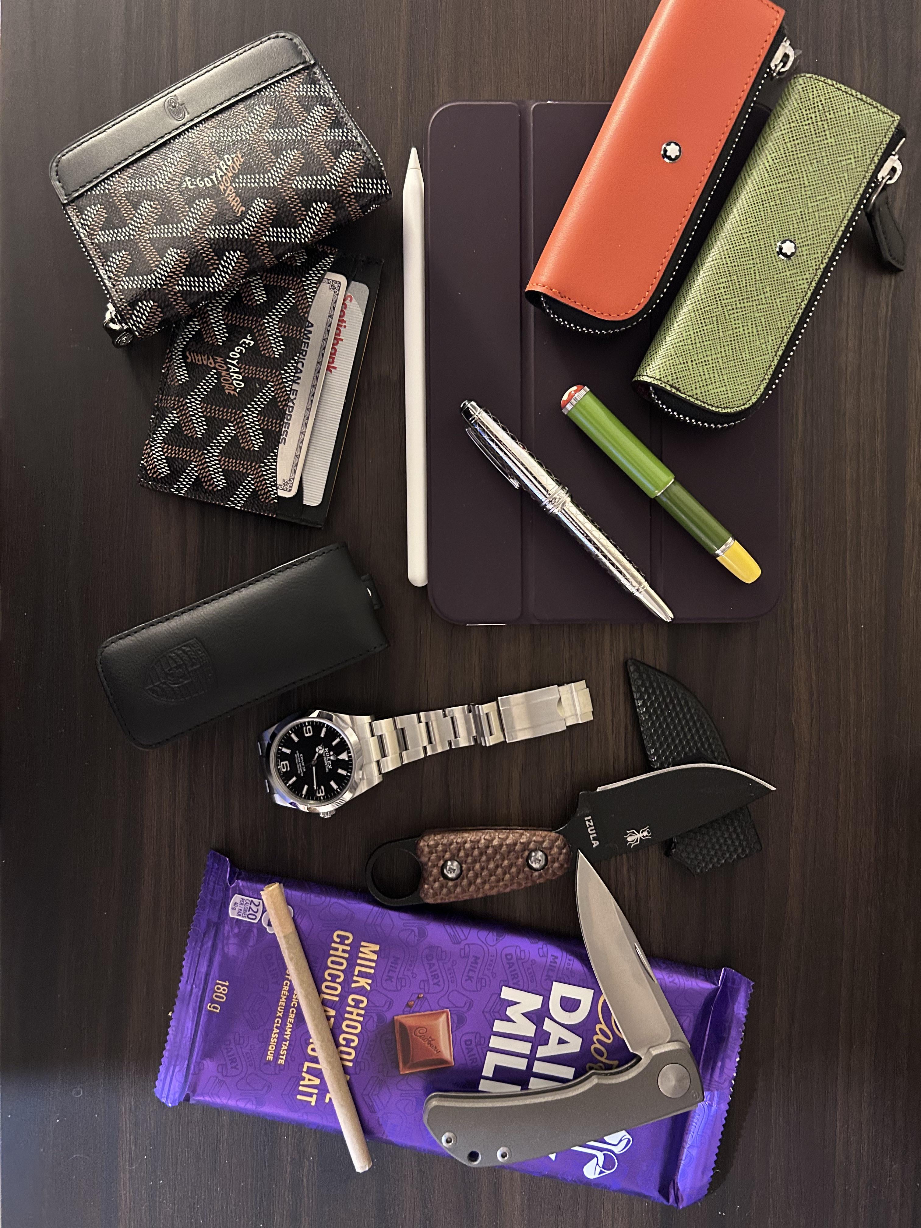 iPad, Montblanc pens and respective cases, goyard matignon wallet and Goyard card case, car keys, watch, izula knife and sheath, CRK impinda knife, my snack (lol) and most importantly the ‘funny stick’