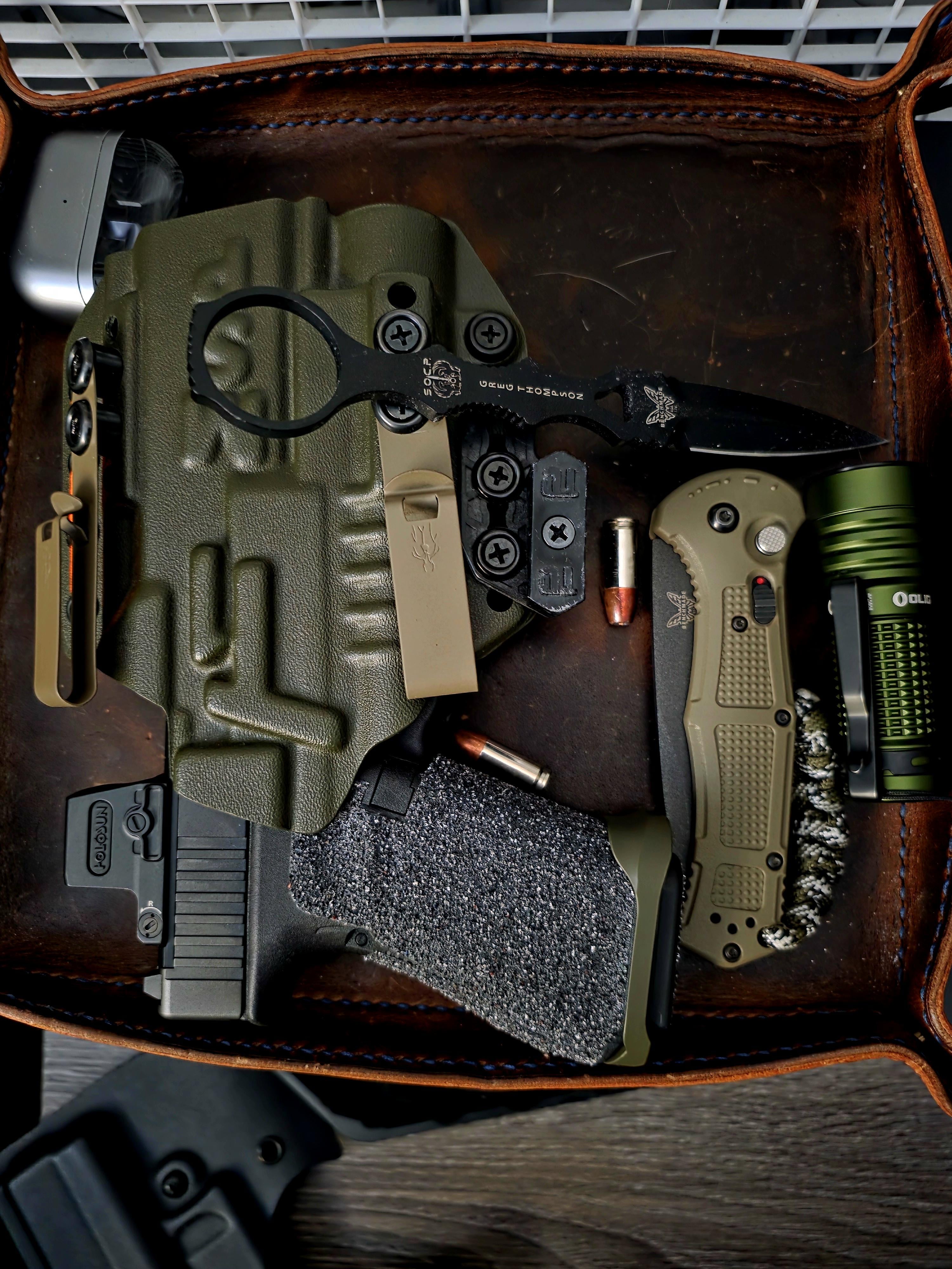 G49 (dressed up with EPS green dot, TLR1HL, SLR magwell) in Tier 1 MSP holster, Benchmade Claymore Auto, Benchmade SOCP dagger, Olight Baton Turbo, Samsung Galaxy Buds3 Pro.