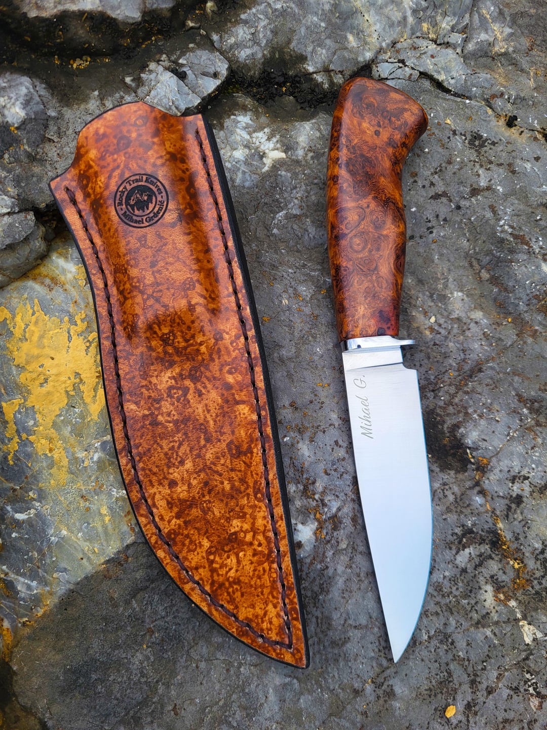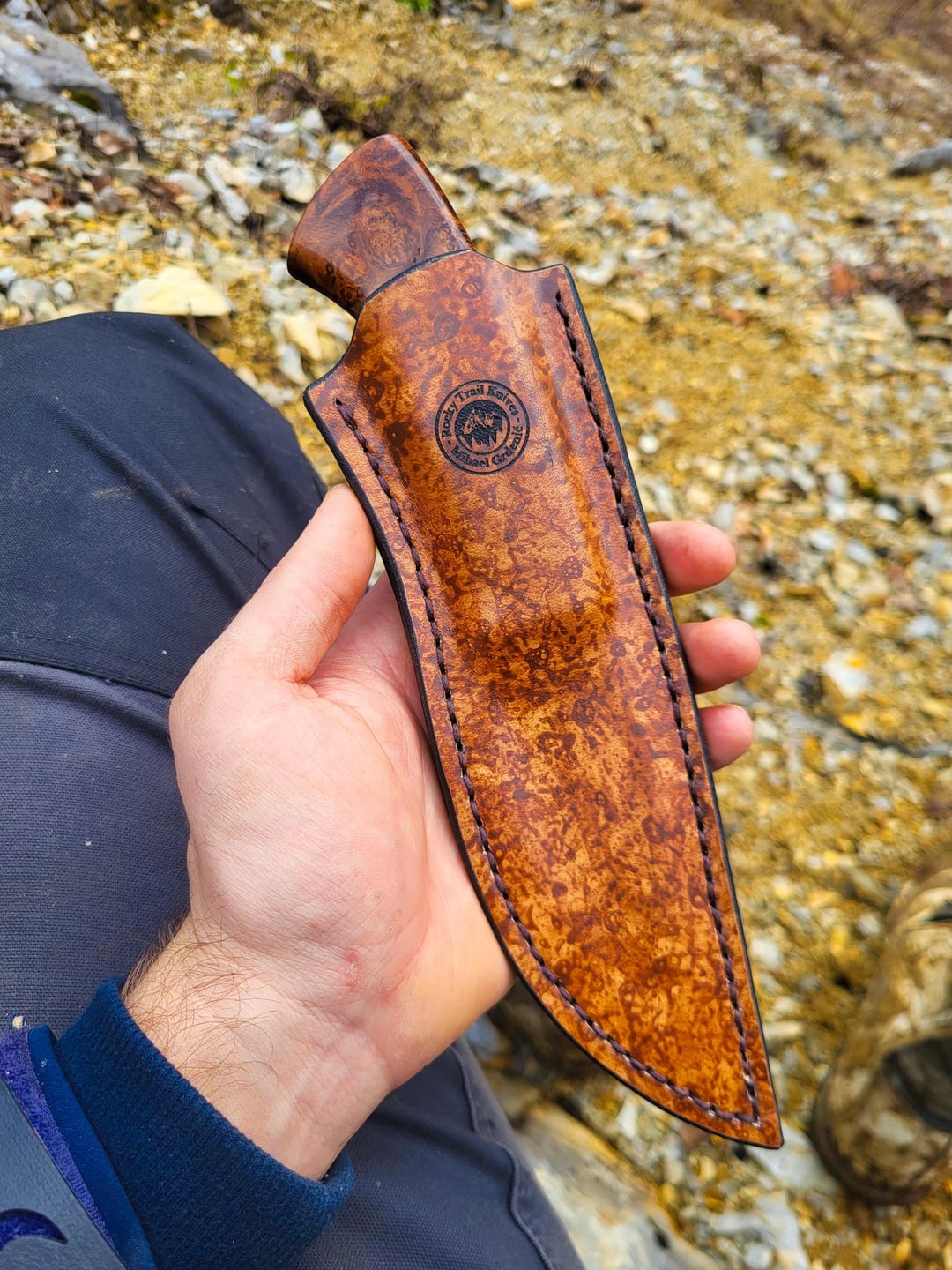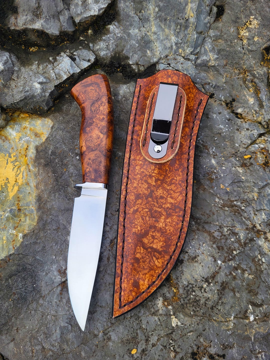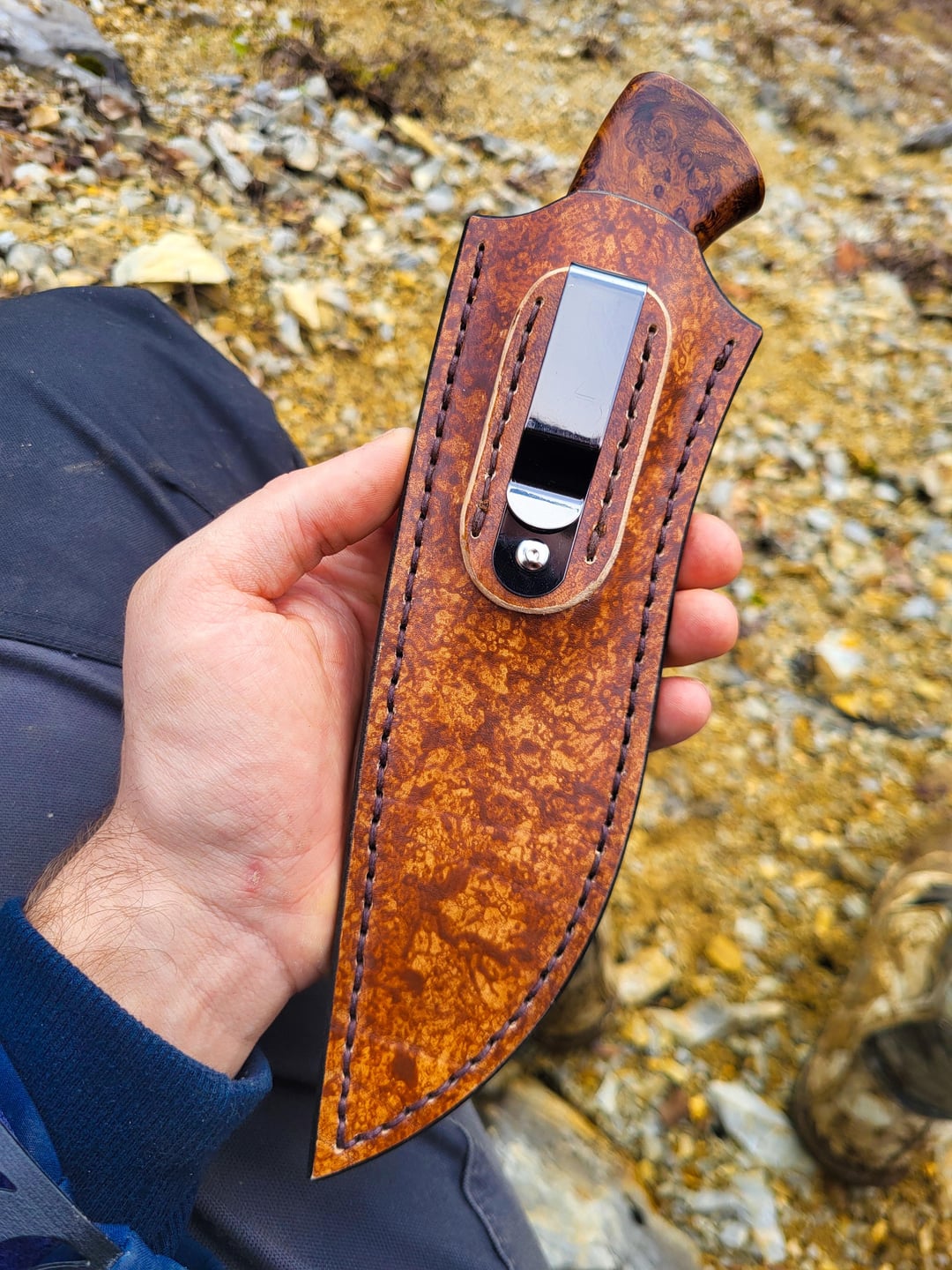 Sheath is a deep carrv made out of 3mm vegetable tanned leather, dyed almost as if to replicate the Amboyna burl. Edges were treated with black tokonole. Has a clip so vou can put it on your pants even on a belt.