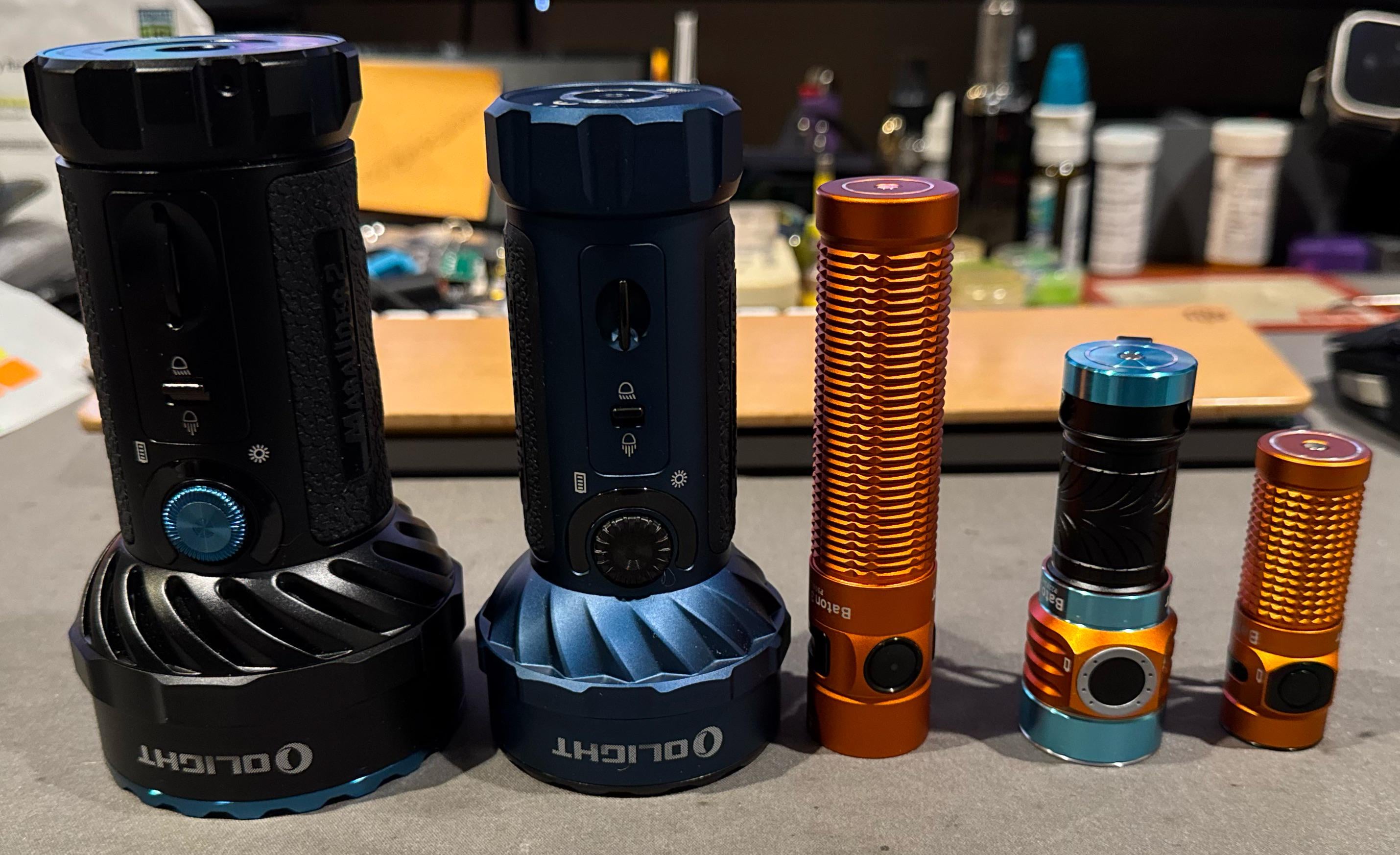 I want a stupid bright flood light, the Olight Maurader 2 (far left) kinda fills that spot but I know theres got to be brighter and better throw.