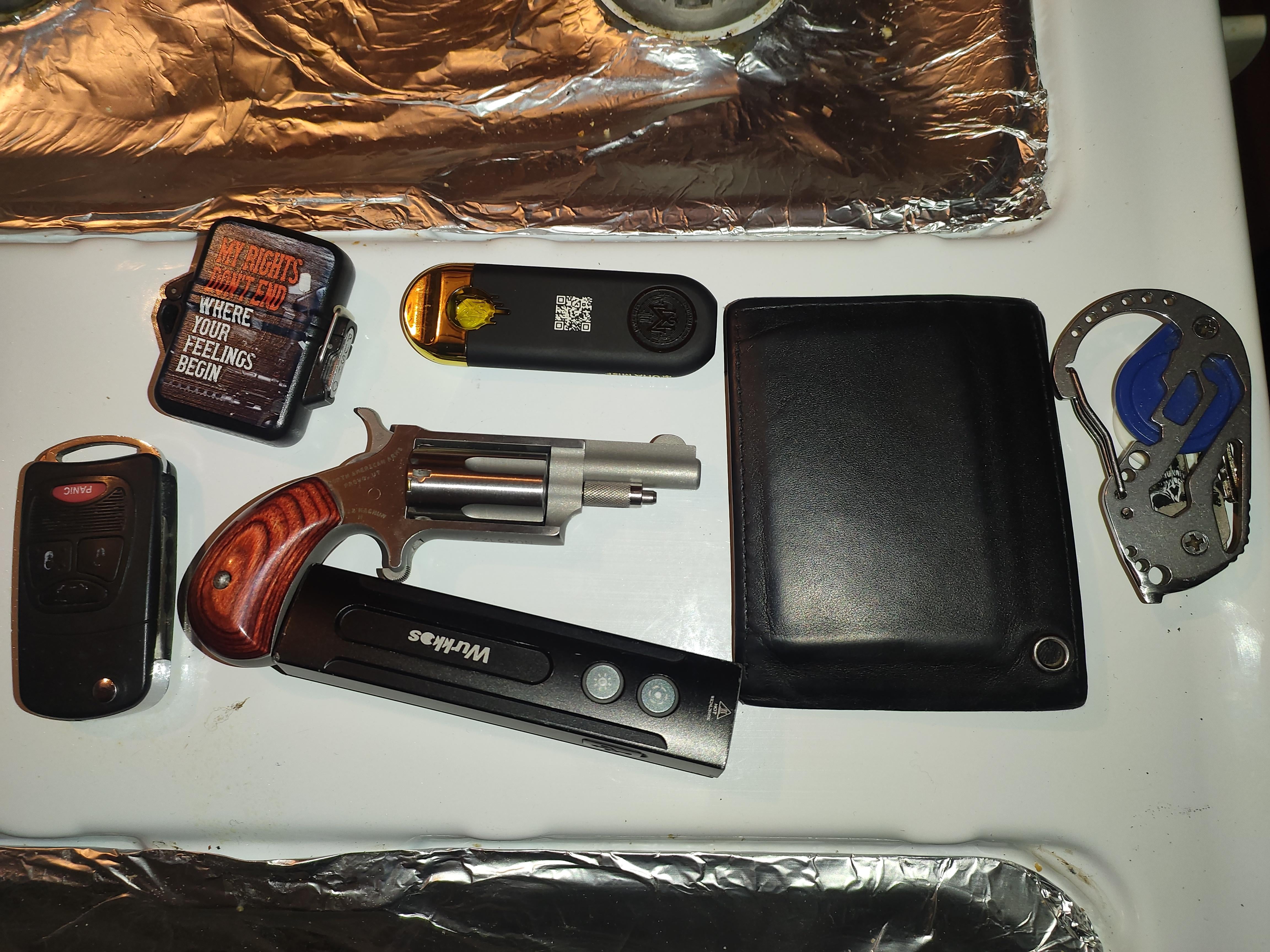 In EDC Bedtime pocket dump. December 10, 2025 Items left to right: car fob, "zippo" case with extra rounds of .22 magnum, NAA 22mc, wurkkos hd01 pro, v3 vape pen, wallet, keys.Not pictured: my sanity.by Your_As_Stupid_As_Me EDC Prev Post What does my bag say about me? December 10, 2025 Next Post My small browning collection December 10, 2025 Related Posts Mom of 3 EDC January 15, 2026 EDC in public transportation January 15, 2026 Today’s Pocket Dump January 15, 2026 1 Comment AutoModerator 1 month ago Thank you for posting to r/EDC! Include a detailed item list (make/model) within **1 hour** of submission. Lists can go in the title, a comment, or the image. Posts without lists will be removed. If you have already provided a list, not further action is needed, thanks | [FAQ](https://www.reddit.com/r/EDC/wiki/faq)*I am a bot, and this action was performed automatically. Please [contact the moderators of this subreddit](/message/compose/?to=/r/EDC) if you have any questions or concerns.*Write A CommentYou must be logged in to post a comment.