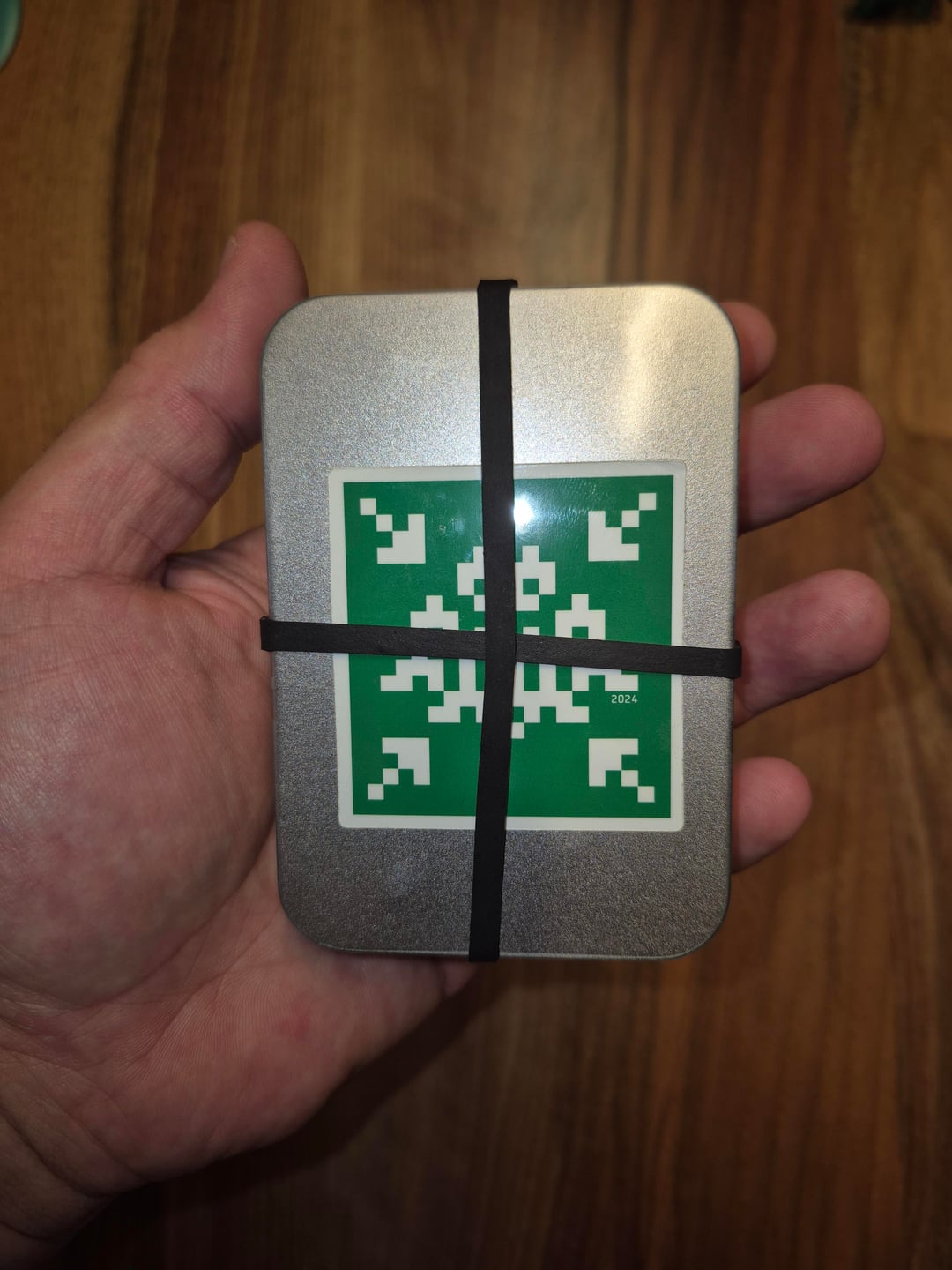 Inside the lid are two pieces of Powertape 3 sticky notes and an emergency cardwith emergency contacts. An external battery a little bit larger than credit card size is attached to the bottom of the container. I added small magnets to it to hold the battery in place better. The whole thing is then held in place by two rubber bands. The sticker is by the street artist invader.
