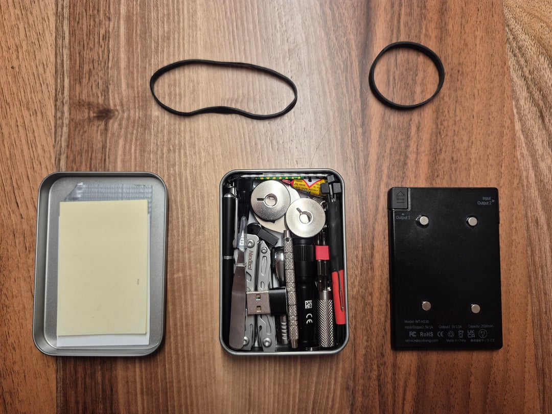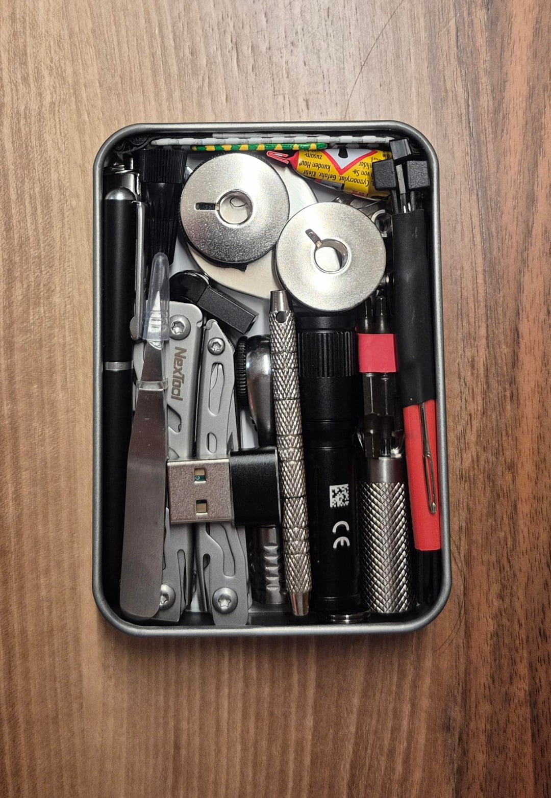 Hi, I've put together an EDC kit in a tin. Please understand that I'm using Google Translate. Just so you know in case something isn't quite correct. I used Jon Gadget's Altoids EDC as a template, but adapted it to the challenges of being a family man. I will also use it for work. I didn't want to be helpless anymore in situations where a specific tool or item was needed. I decided to buy a tin that is actually intended for storing playing cards because it is flatter. (and Altoids is hard to find in Austria). I have mainly purchased the items on Amazon over the past few weeks. The items in the tin can fill the space so well that the tin makes no noise when it is shaken.