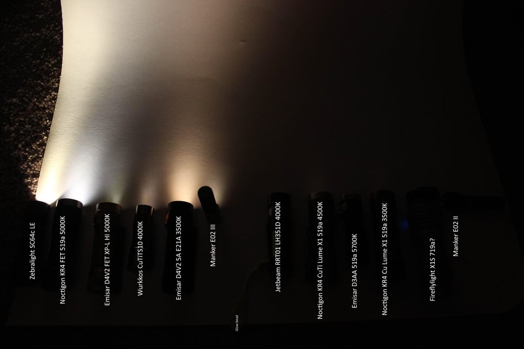 Second is a front-on view of the remainder, also labeled so you can tell what's going on. The perennial moonlight favorites, E02 and RRT01, are actually the brightest! Actually this kind of isn't a fair comparison because I used my modded SST-20 2700K E02 II which is lower than the stock 4000K.