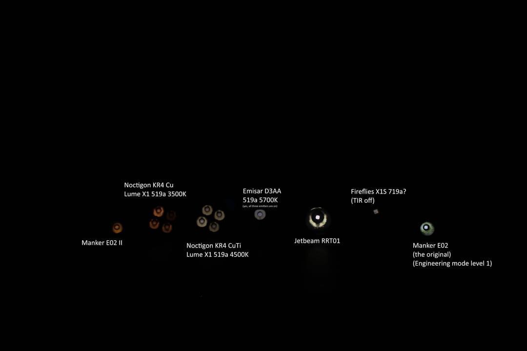 The newcomers, however, edge them all out! The Lume X1 provides some insanely low levels in the Noctigons and Fireflies (which is an XHP50, not 719a), but what might be the unexpected champion is the D3AA and its two severely underpowered emitters! Check out the third picture! They are, in fact, on!