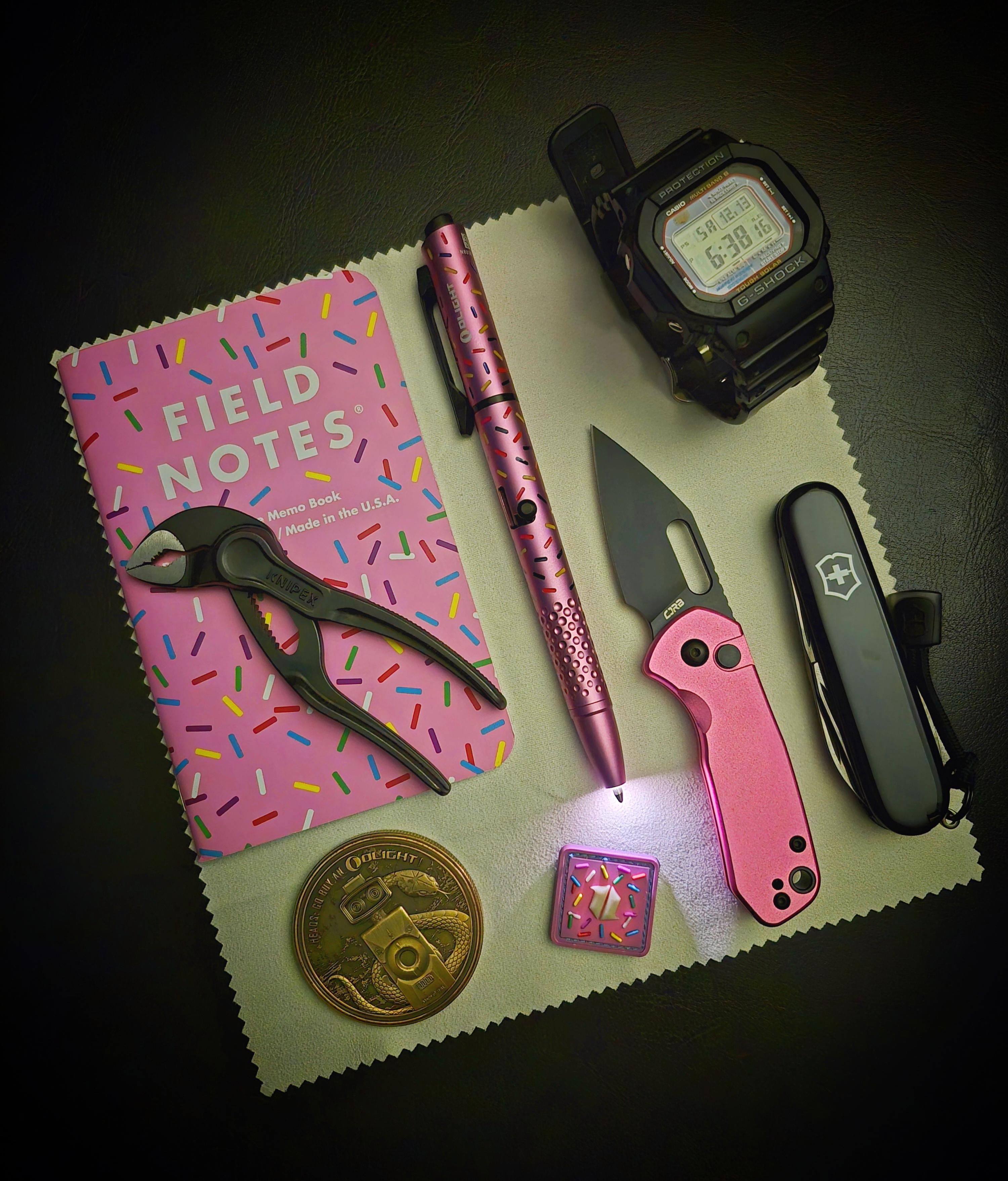 In EDC Candy Coated sweet Saturday carry. December 13, 2025 Left to Right:Field Notes dessert warrior notebook.Knipex Cobra XS.OLIGHT coin.O'pen Glow Donut edition.Blade HQ dessert warrior patch.CJRB Pyrite Mini. Gshock GWM5610.Victorinox spartan onyx black.by Broteinpoder EDC Prev Post Saturday December 13, 2025 Next Post Don’t waist your money!😉 December 14, 2025 Related Posts 3rd Shifter January 15, 2026 Here’s my flu season kit January 15, 2026 Mom of 3 EDC January 15, 2026 1 Comment AutoModerator 1 month ago Thank you for posting to r/EDC! Include a detailed item list (make/model) within **1 hour** of submission. Lists can go in the title, a comment, or the image. Posts without lists will be removed. If you have already provided a list, not further action is needed, thanks | [FAQ](https://www.reddit.com/r/EDC/wiki/faq)*I am a bot, and this action was performed automatically. Please [contact the moderators of this subreddit](/message/compose/?to=/r/EDC) if you have any questions or concerns.*Write A CommentYou must be logged in to post a comment.