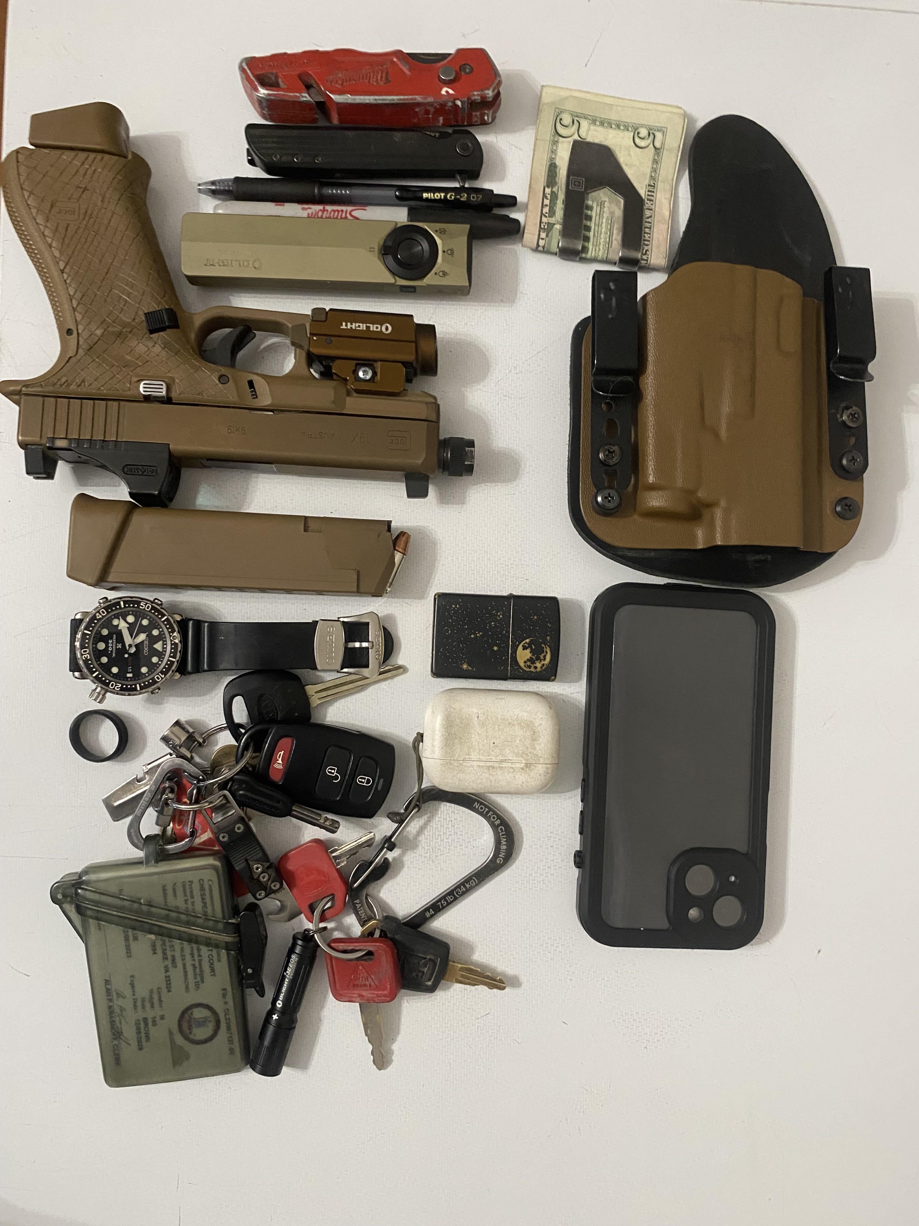 Not everything is in my pockets 100% of the time, the main keychain is always locked in work truck glovebox (badges and passes are in there) and the spare mag rides in the car door.