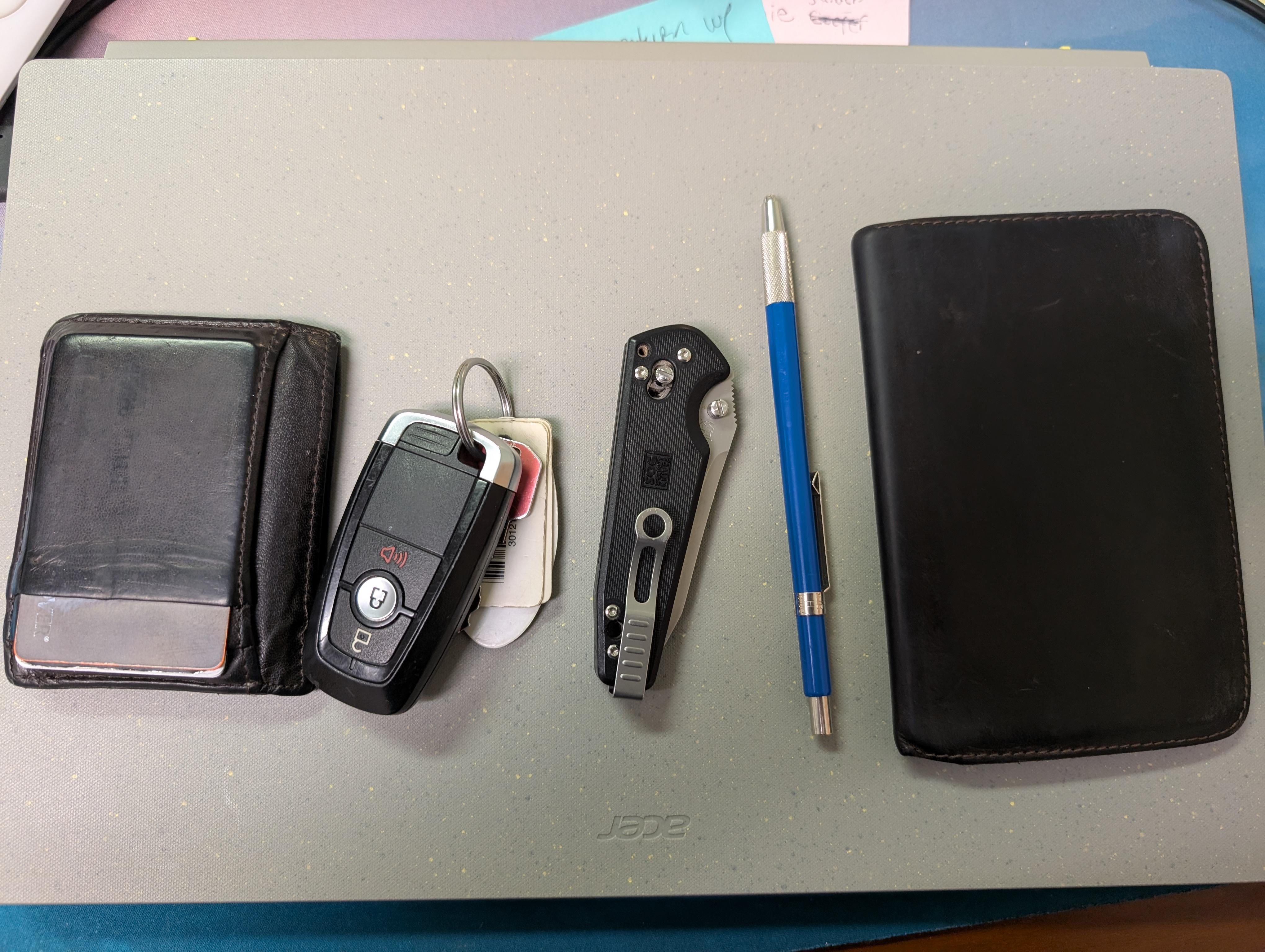 I have a SOG mini X-ray vision, a lead holder who's name I don't remember. A knock off field notes notebook with a leather cover. A slim wallet I think from Etsy (it's been many years on that) and just a keyring, with my keys.