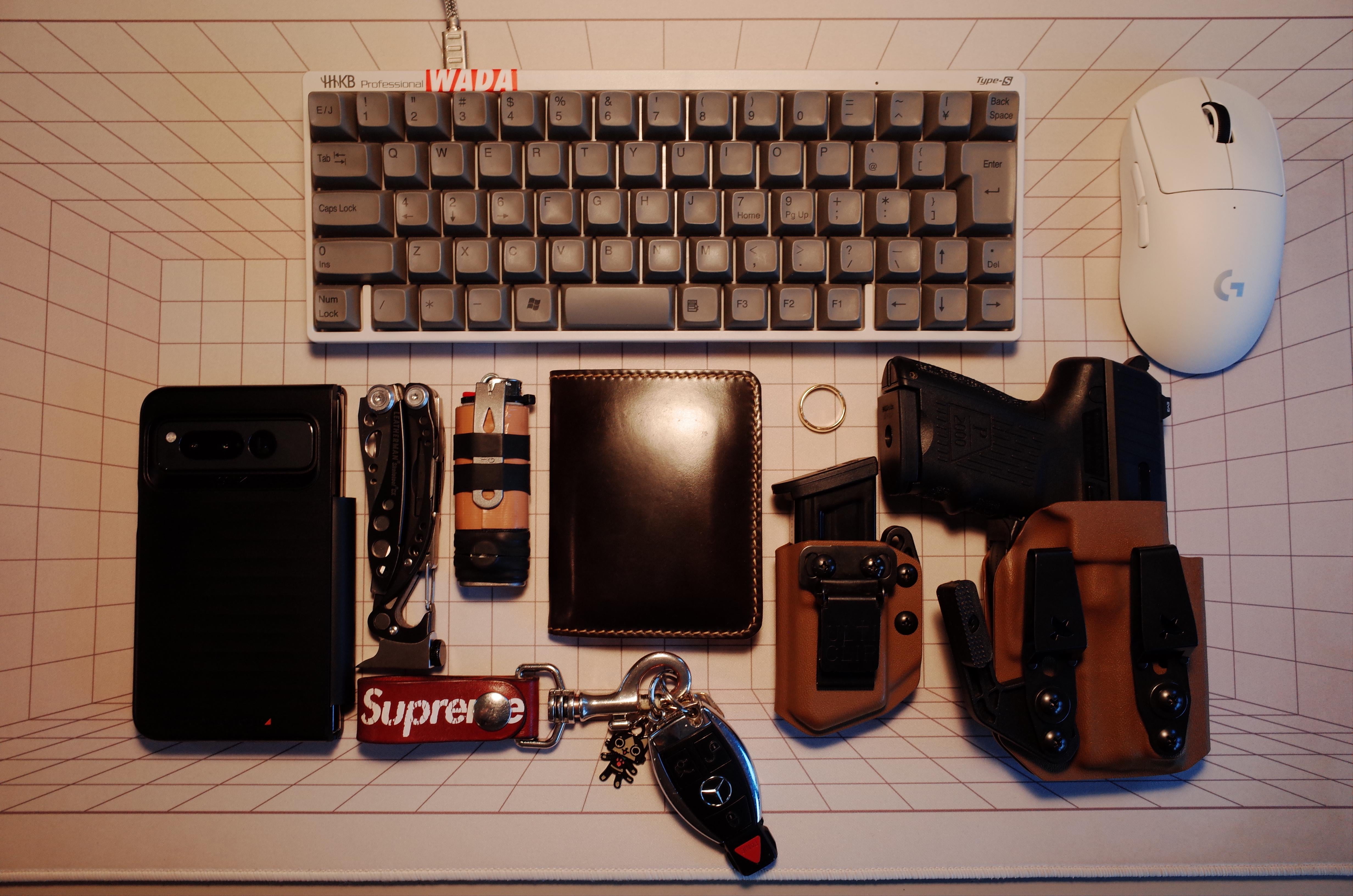 Pixel Fold, Skeletool w/ Hammer Mod, Bic Survival Kit, Keys w/ Palico, Dream Creeks Shell Cordovan Wallet, Tiffany Forever Band, P2000SK V0 LEM w/ Spare Mag