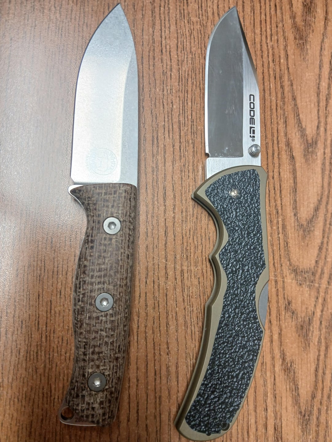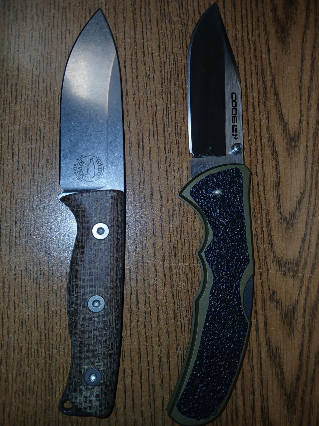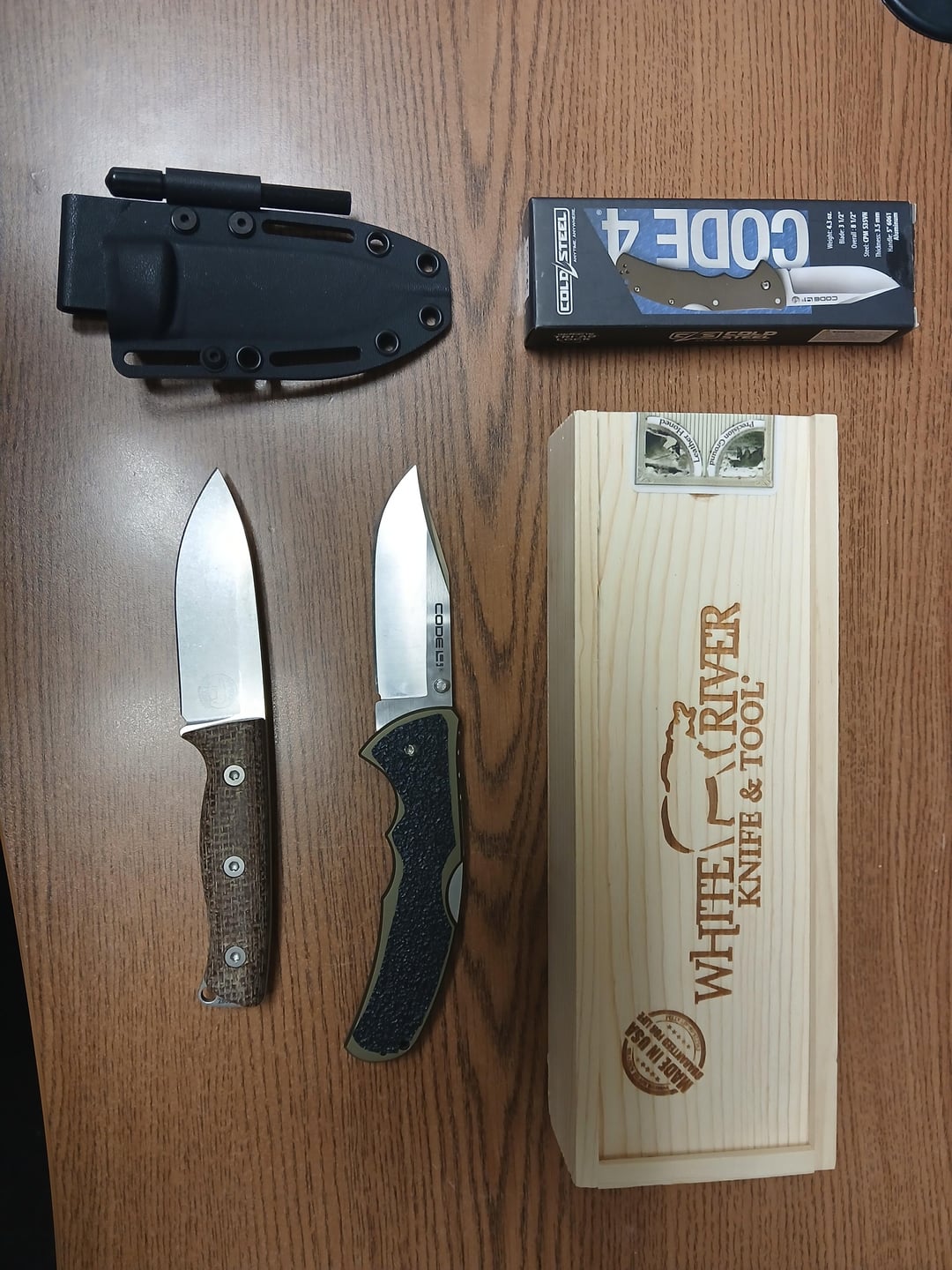 Well, welcome to my two new daily carries: The White River Ursus Cub and the Cold Steel Code 4. These are my first two "premium steel" knives, so I spent an inordinate number of hours looking up metallurgic data on different types of steels, heat treats, youtube reviews, etc. all while I assume my wife decided I must be going through a midlife crisis.