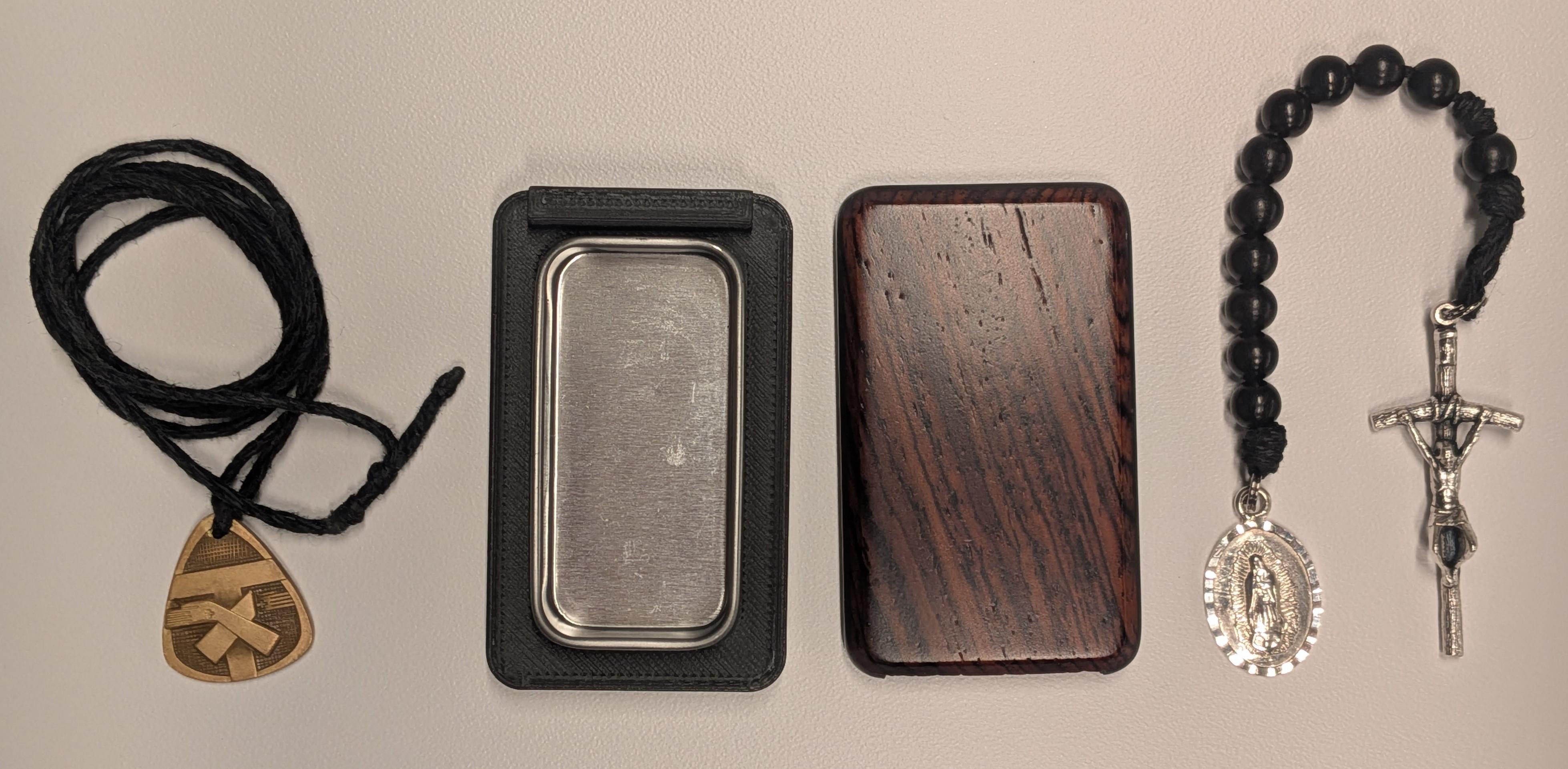 * Franciscan Scapular Medal. Brass, bought used, cleaned up and worn on a black hemp cord. Carried with me 24/7 except when I shower. * One-decade Rosary. Wood beads, hemp cord. Papal crucifix in zamac, Our Lady of Guadalupe medal in sterling. Made it myself. Rosary carried with me in a nice wood box I got off Etsy.