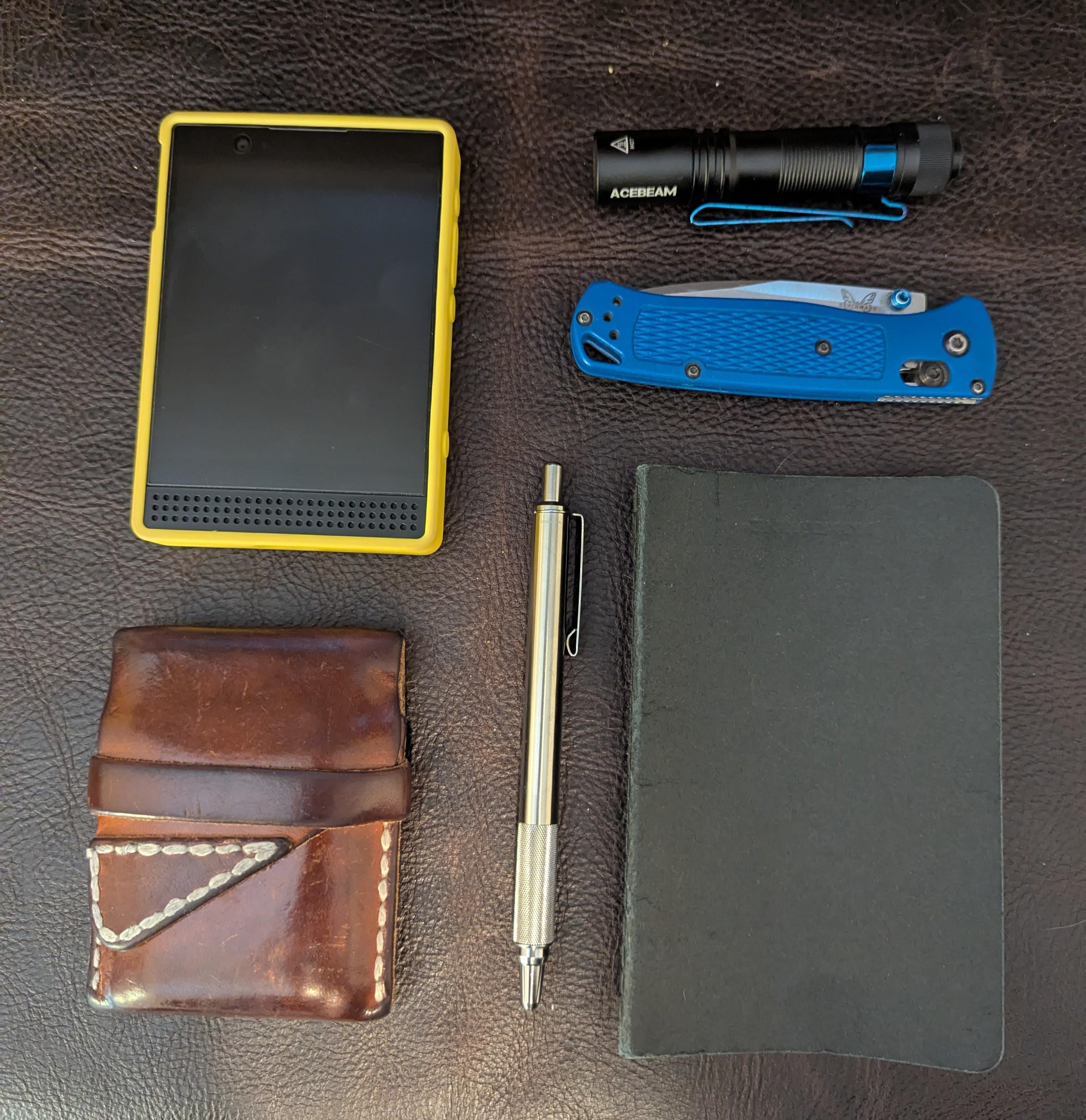 anisleateher 1 month ago Phone: Light Phone IIIWallet: Handmade walletFlashlight: Acebeam Pokelit AAKnife: Benchmade BugoutPen: Zebra F-701Notebook: unknown notebook