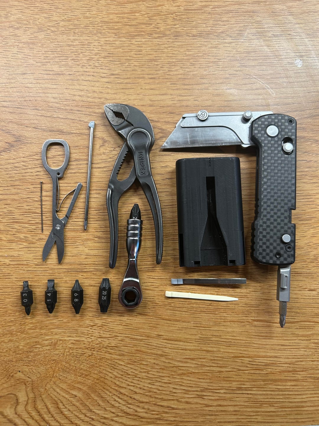 In EDC New pocket EDC setup December 16, 2025 Otacle U1 utility knifeTodd Parker’s 3D printed Knipex Sheath 2.0 (back in stock soon)Knipex 4” cobra xs pliers711L mini ratchetSteinwhale double-sided bitsSwiss Card scissors/toothpick/tweezers/pen by Special-Somewhere-86 EDC Prev Post Tanto Tuesday December 16, 2025 Next Post Brass s2+ December 16, 2025 Related Posts Actual EDC and slightly extended EDC January 15, 2026 Cheap off day EDC January 15, 2026 3rd Shifter January 15, 2026 1 Comment AutoModerator 4 weeks ago Thank you for posting to r/EDC! Include a detailed item list (make/model) within **1 hour** of submission. Lists can go in the title, a comment, or the image. Posts without lists will be removed. If you have already provided a list, not further action is needed, thanks | [FAQ](https://www.reddit.com/r/EDC/wiki/faq)*I am a bot, and this action was performed automatically. Please [contact the moderators of this subreddit](/message/compose/?to=/r/EDC) if you have any questions or concerns.*Write A CommentYou must be logged in to post a comment.