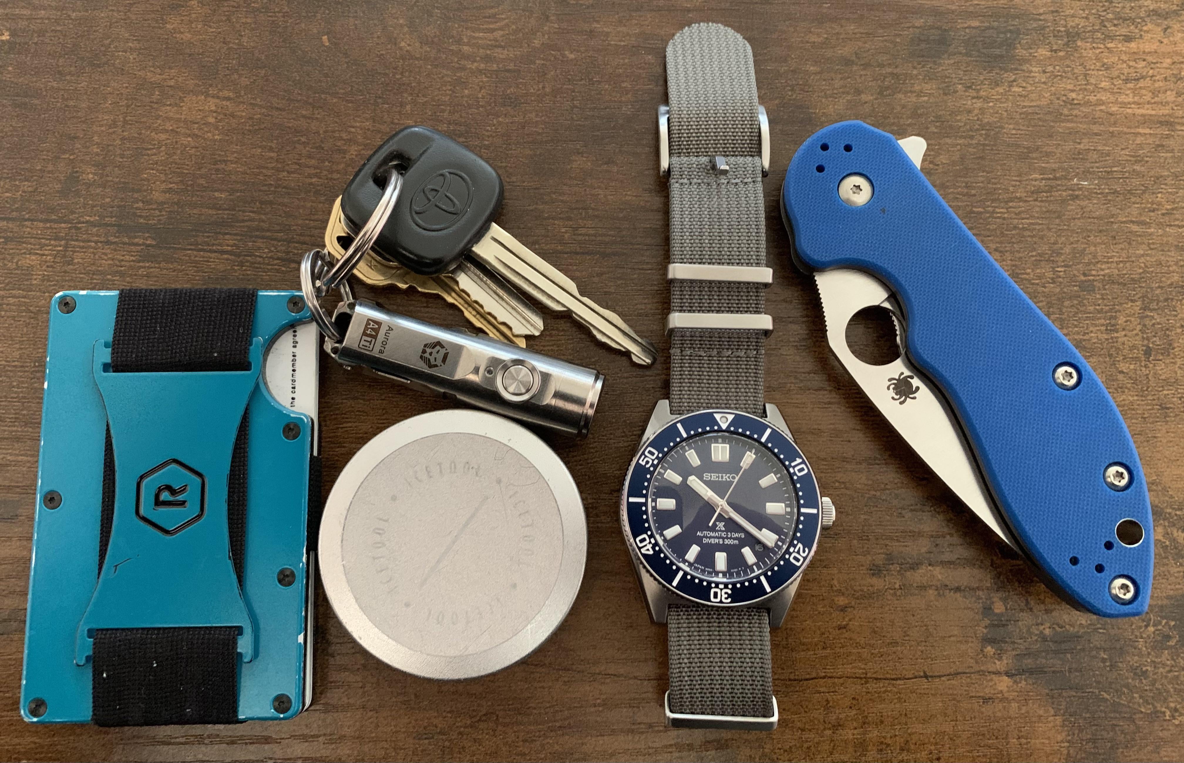 My spyderco domino came in this morning. I have a mxg clip and some skiff bearings in the mail. Shown is a ridge wallet, Icetool mini snus can, rovyvon aurora a4 titanium flashlight, seiko spb451 on a watch gecko nato strap, and the bento box shop domino.