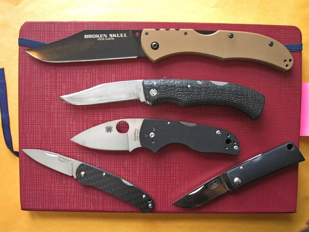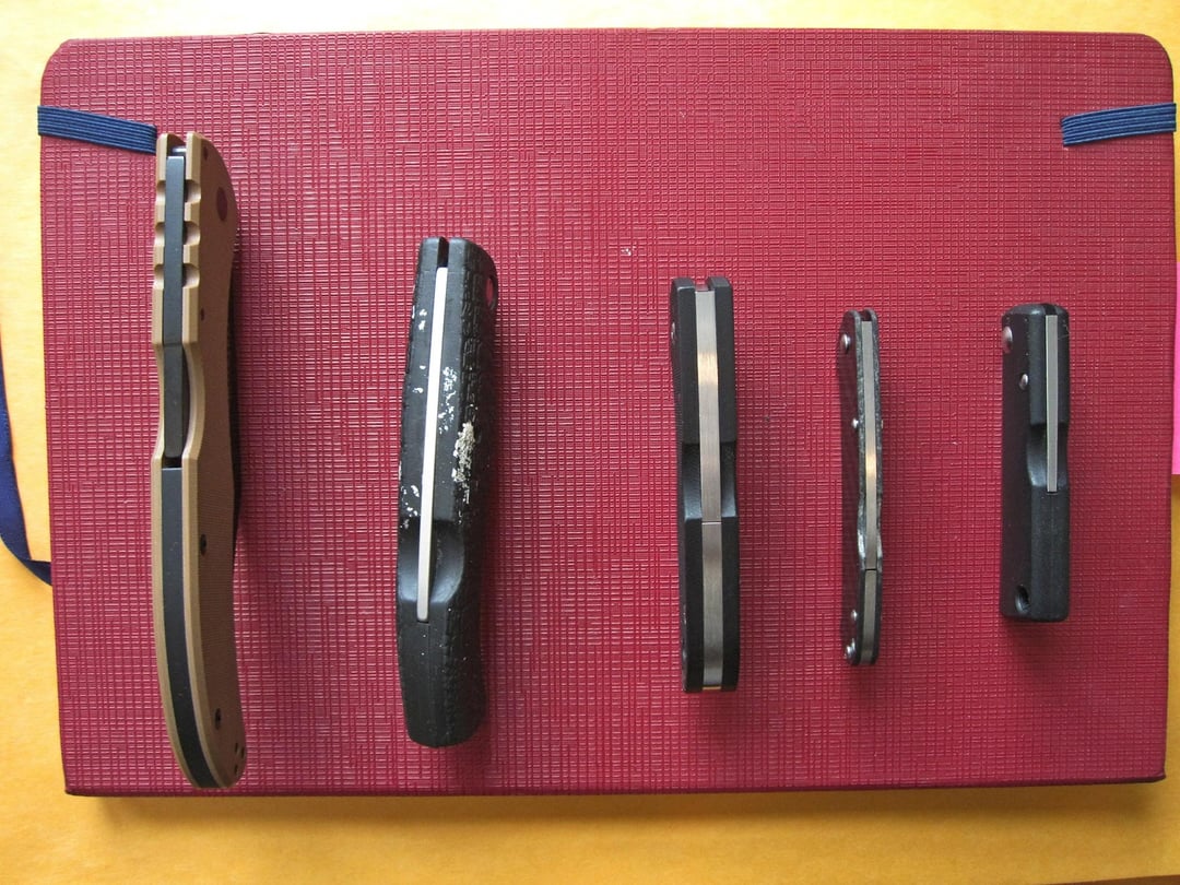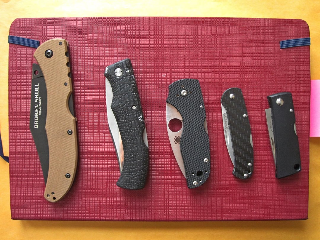 L-R: Cold Steel Broken Skull (XHP + G10), Gerber Gator Mate (420HC + Kraton-covered FRN), Spyderco Lil' Native (S30V + G10), G. Sakai Preppy (VG10 + carbon fiber), Fallkniven U4 (laminated SG2 + FRN). The whole bunch weighs about 10 ounces altogether.