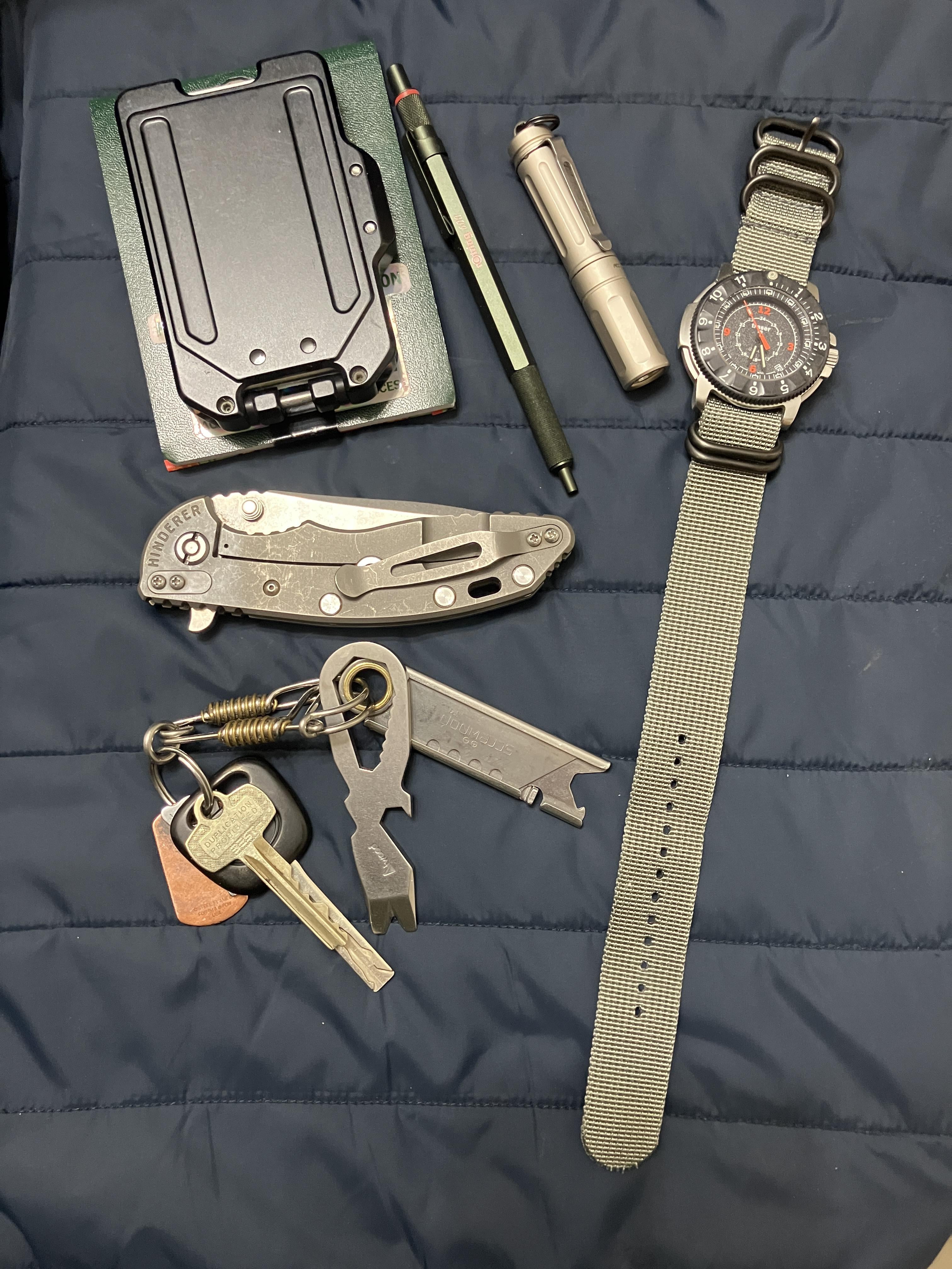 * Pocket notebook * Scudo wallet (great wallets but they discontinued their simpler ones without the interchangeable artwork – most of which is pretty cringy, I think they would have sold a lot more if there where better options) * rotring 600 pen * surefire Titan 2 flashlight * traser watch * hinderer xm-18 3.5” * screwpop razor blade * Atwood atwrench * starline gear key tag in copper