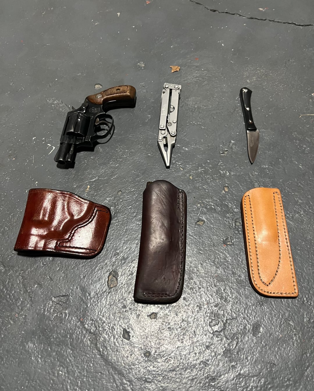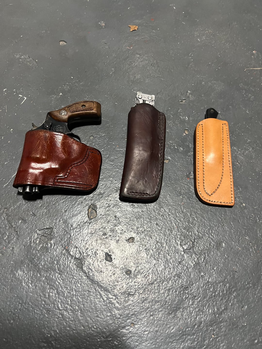 S&W 36 no dash in a Don Hume holster, Kershaw multitool in a custom sheath from Rowe’s leather, and an A.G. Russell woods walker in their in house sheath