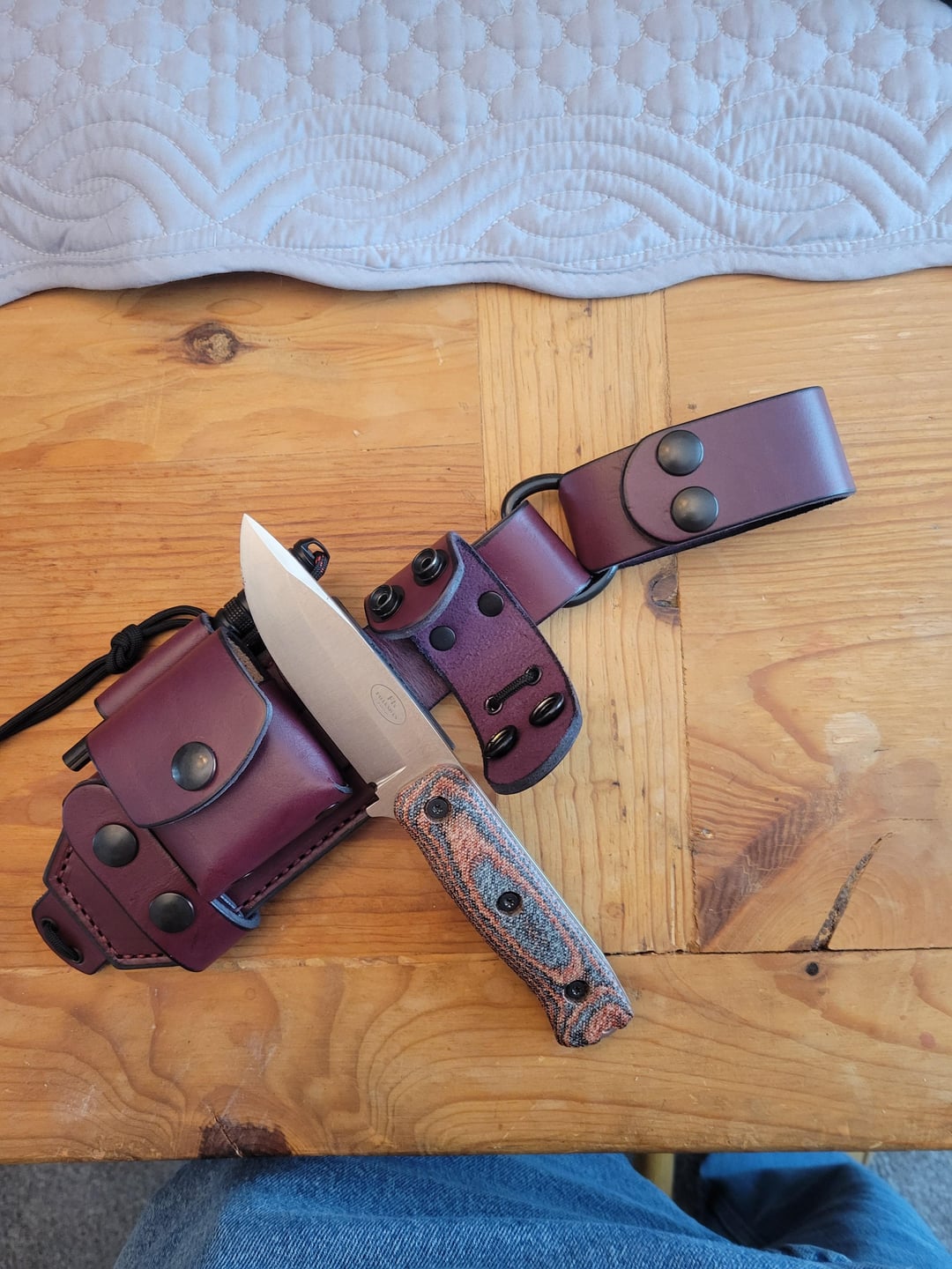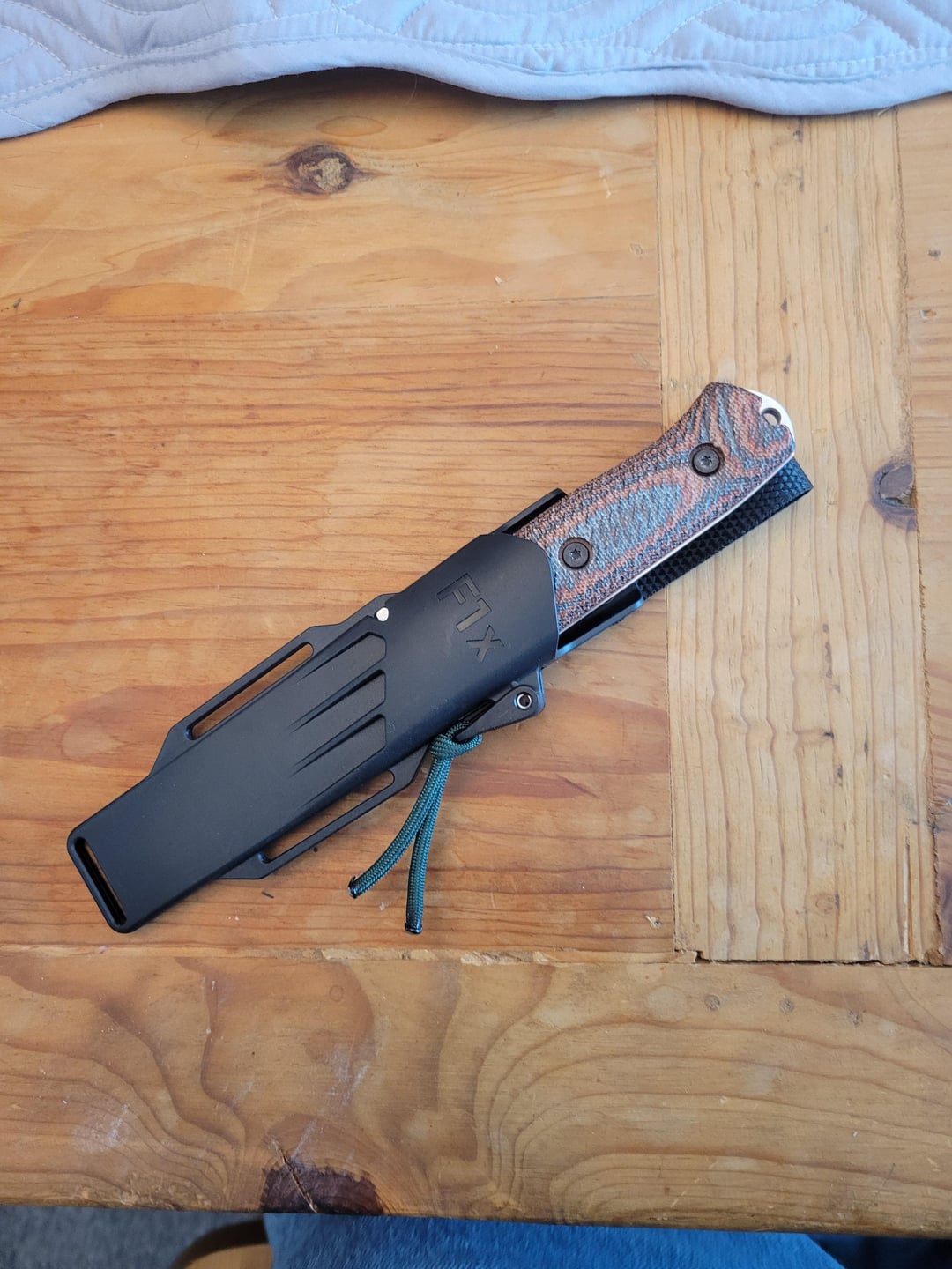 Decided to get some new scales for my F1x. CarrollsCustomScales on ETSY fixed me right up with a nice looking set of micarta scales that fits well with my custom sheath. They also work with the OEM sheath, but it is a very tight fit. Pretty happy with them.