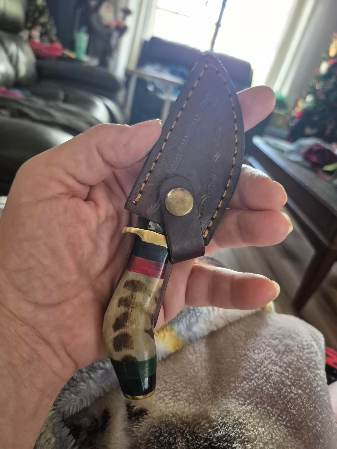 Damascus knife about 7 inches long. Handmade Damascus! I know what it really is but my bil thought he was getting me something special. It’s still going into the collection. Ps I have stupid big hands and that really a 7 inch knife.