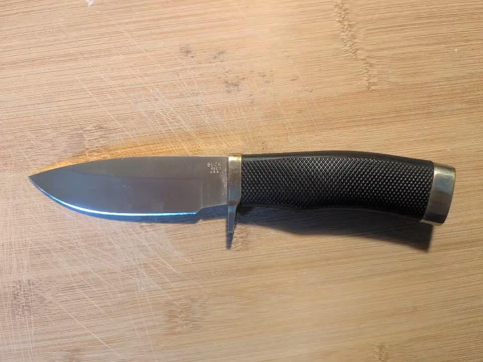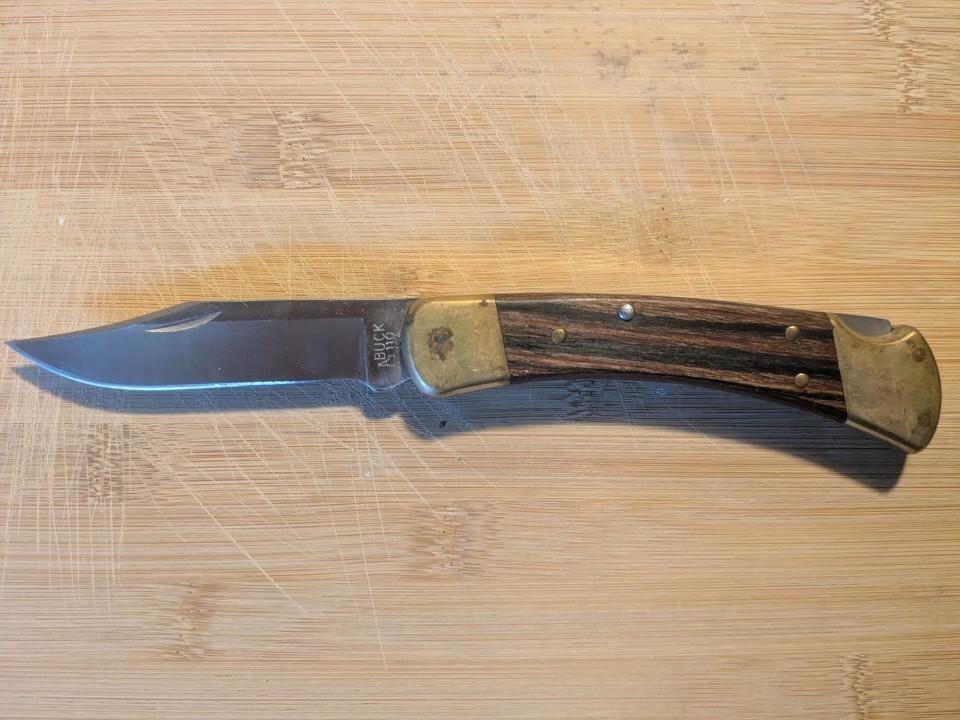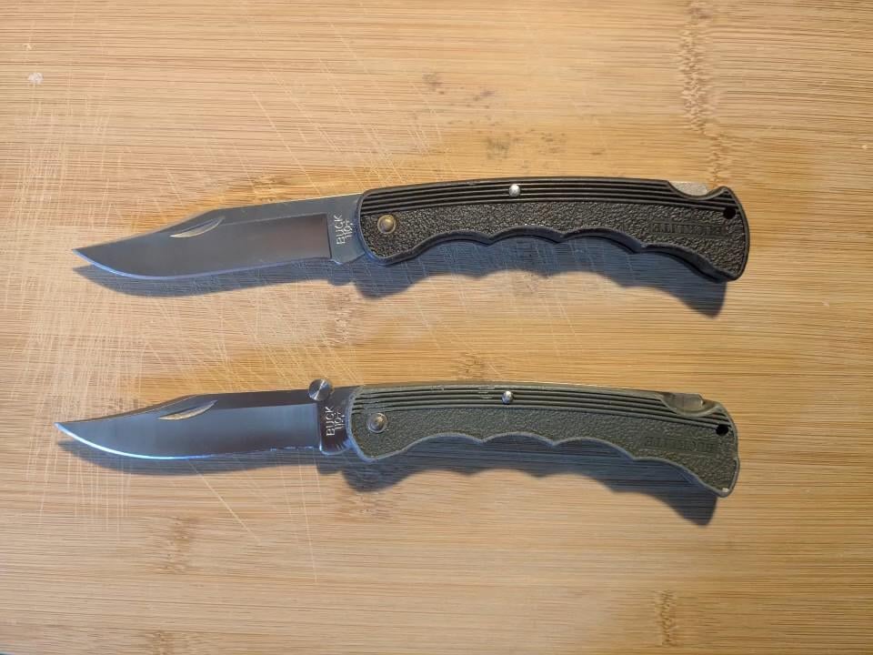 My first post here, and compared to some of the other knives I've seen here these are generic lol, but I thought these were cool and I'm sure a few others will too. Left to right: 692 Vanguard w/ rubber handle & gold-tinted blade (idk much about these ones lol) Pair of Bucklite 426s with 110 blades, wood handle 110.