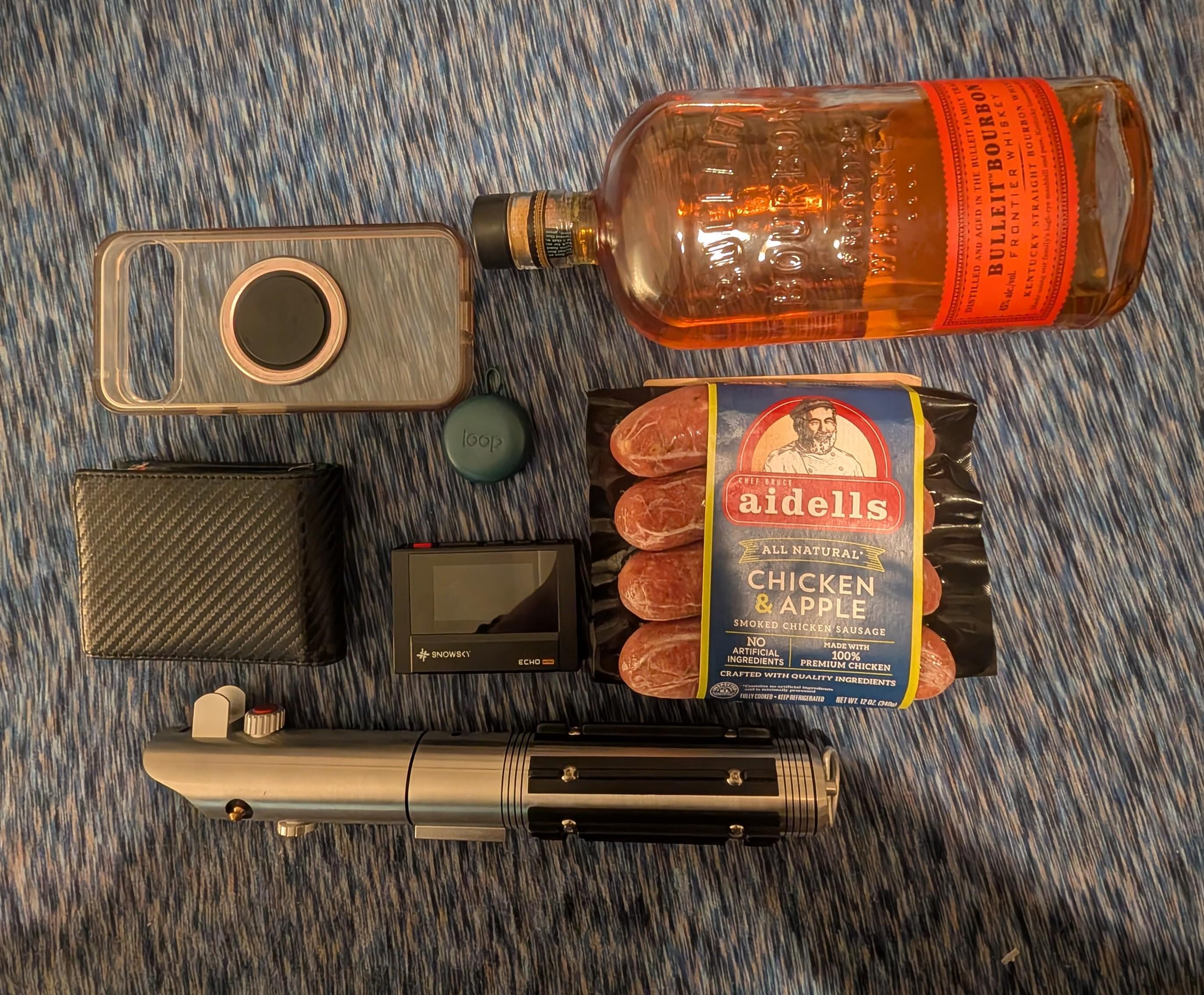 Google Pixel 9 Pro XL, aidells sausage, Fiio Snowsky Echo Mini, wallet, Bulliet Bourbon, lightsaber