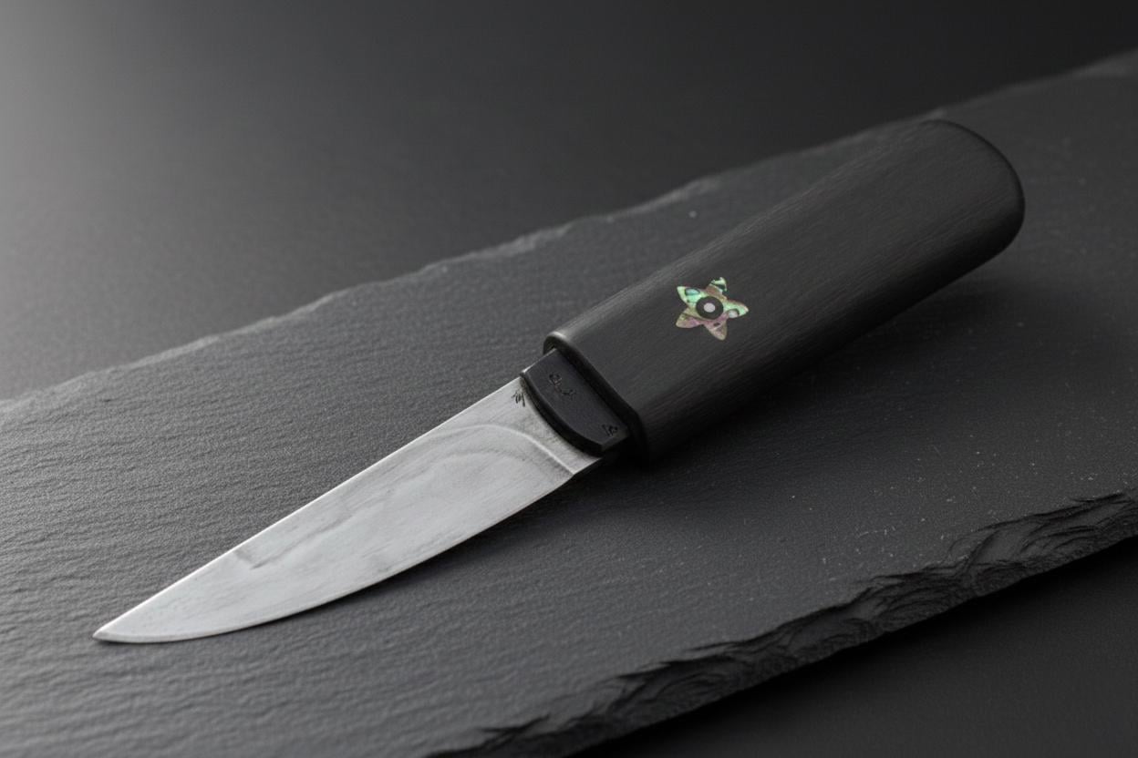 C125u steel, black canvas micarta habaki (ferrule), carbon fiber handle and abalone inlays on both sides