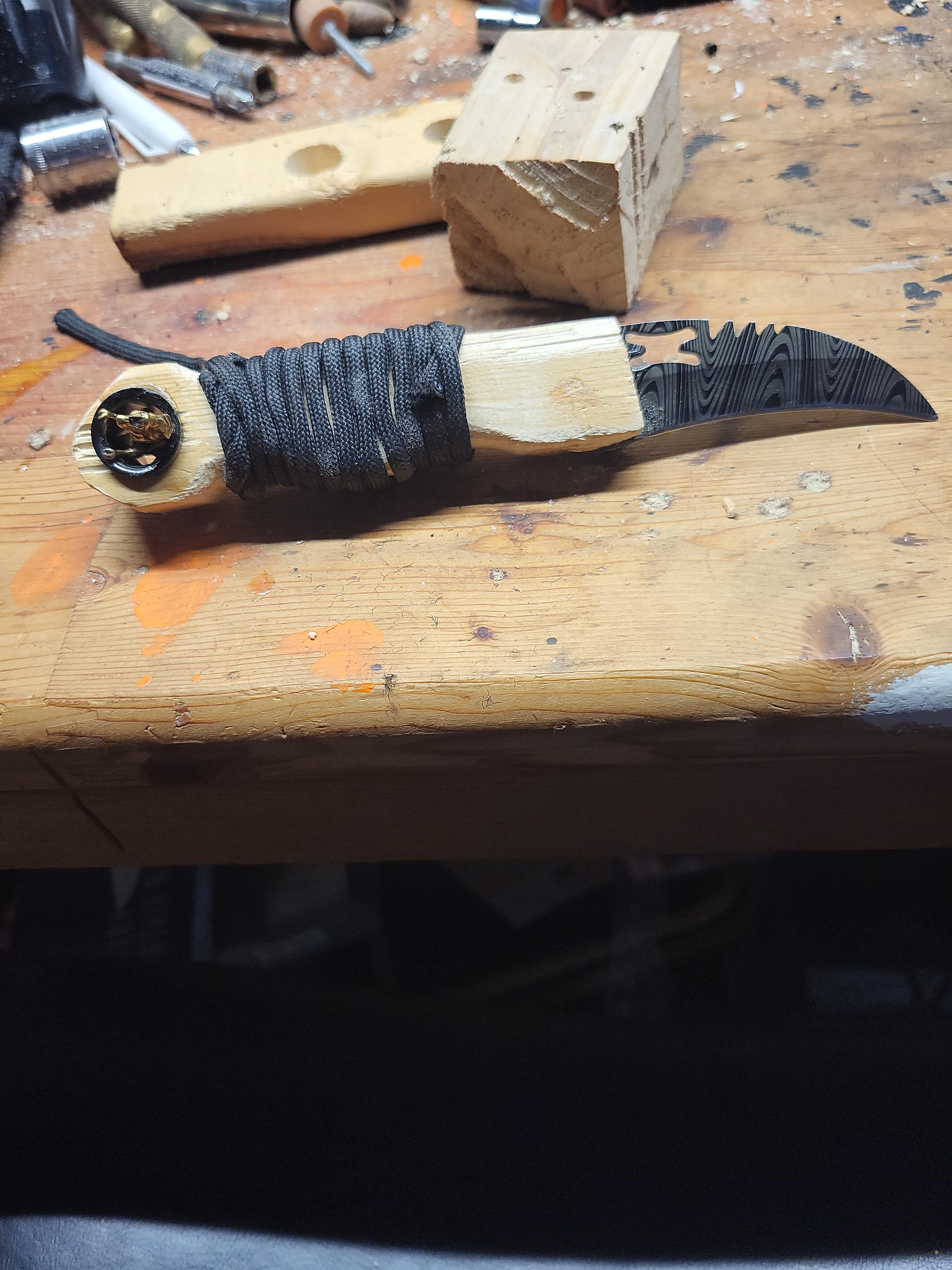 Came into possession of what as far as I can tell was a cheap flea market knife. The scales were a little worse for wear. I decided to make my first knife handle using the blade of the cheap knife. It's not the best thing on the world, it's a little weird balance but I did it and I'm okay with it as a first run. Wood handle, wrapped in Paracord, metal accessories (there's a little Trex in the bottom if you can't see). The blade is stainless stamped to look like Damascus that I assume will break if ever actually used. I would give myself an over all 4/10 but decided to share any way!