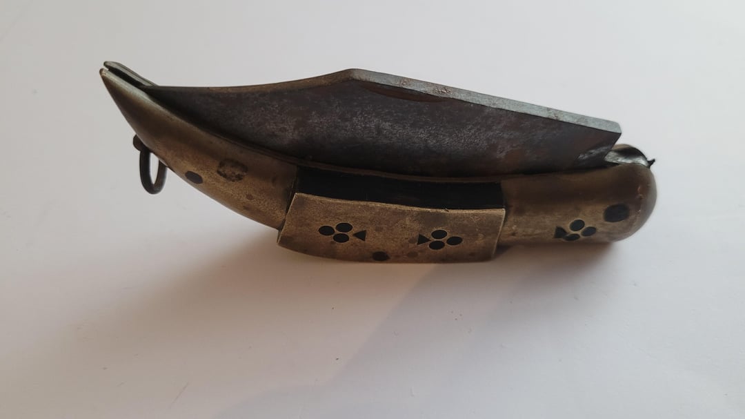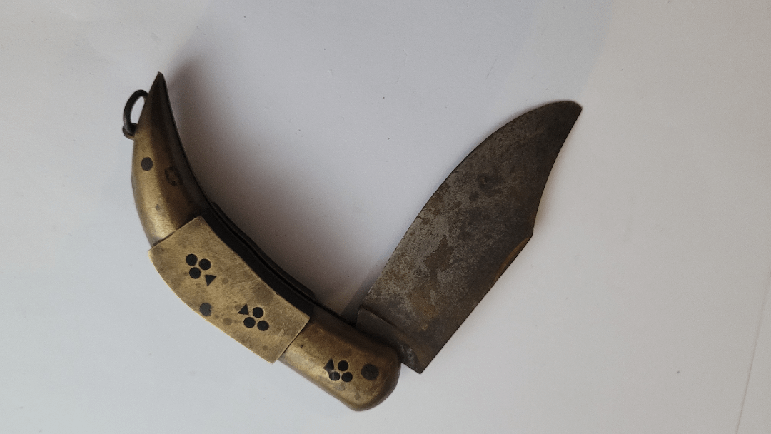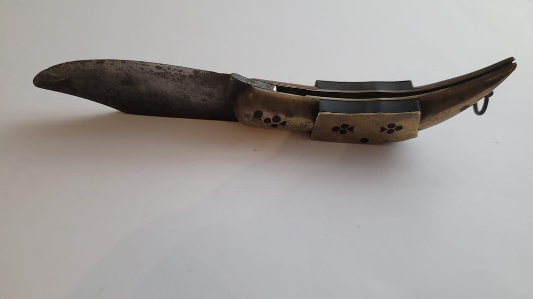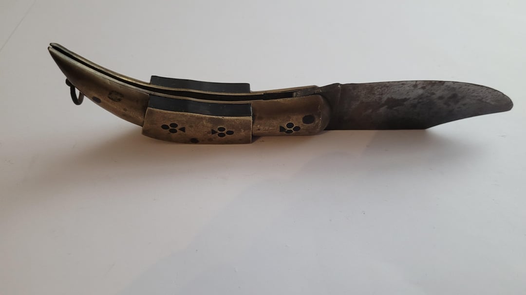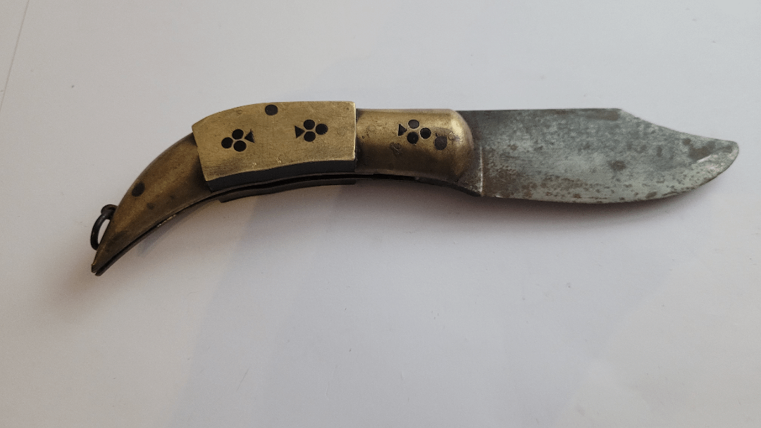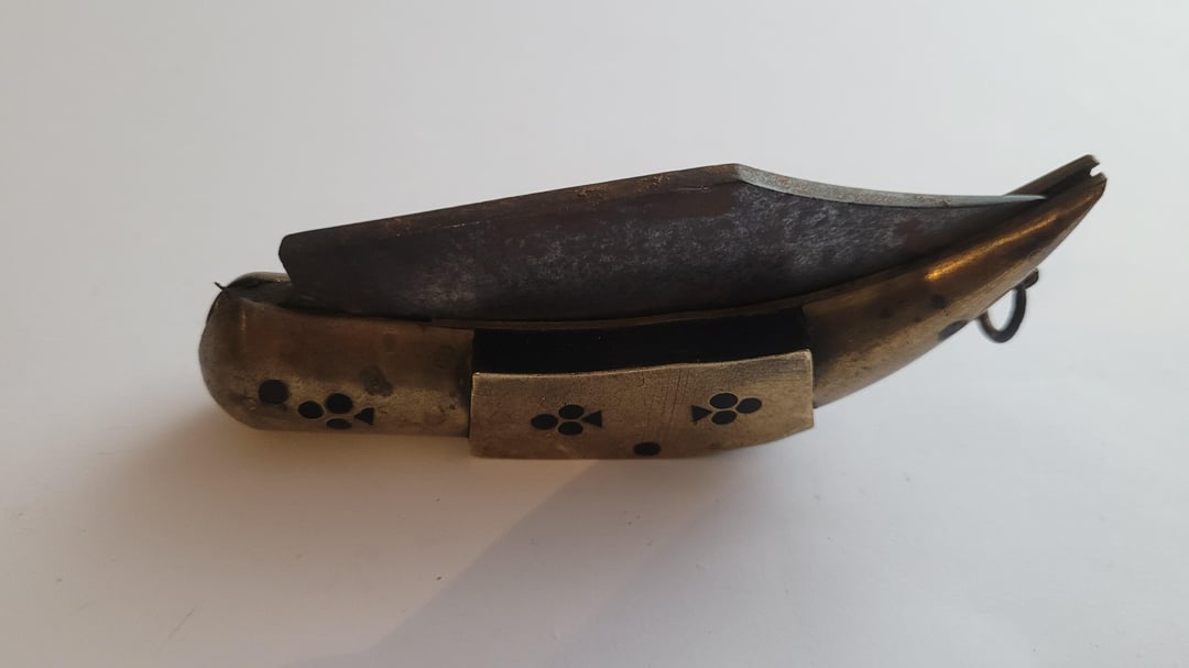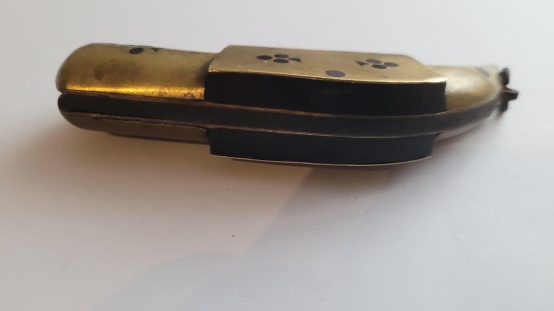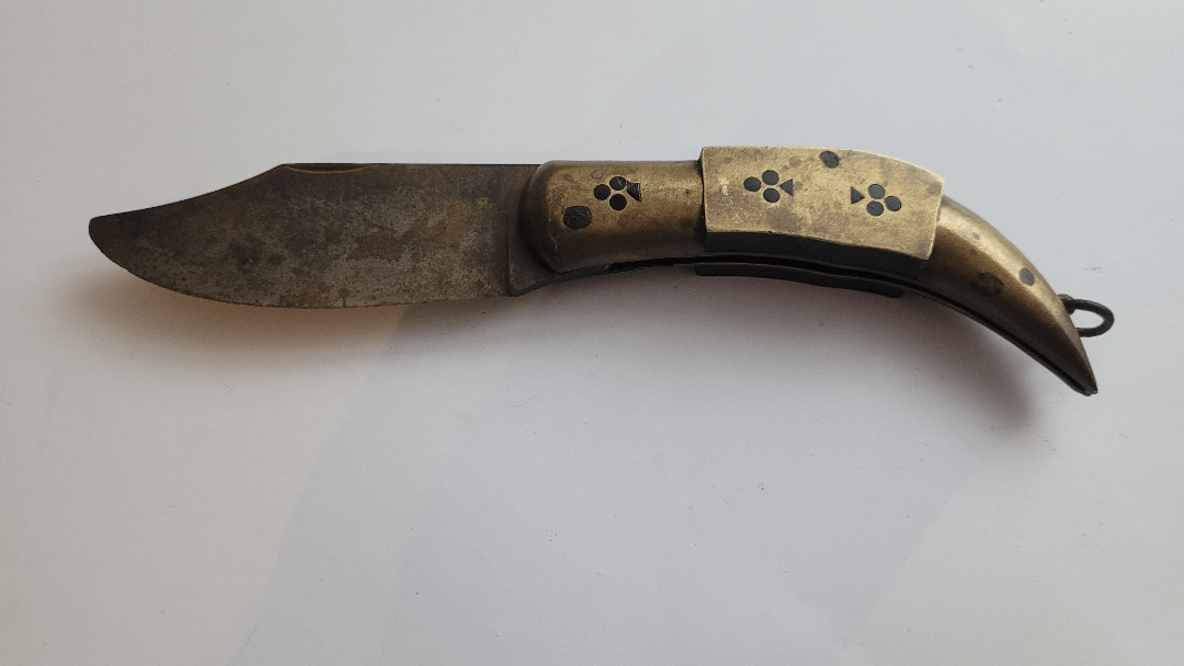 Found this Knife at an antiques market. The handle seems to be brass with dark horn. The backspring is one of the strongest I ever hand in knife. Also it has a half stop.