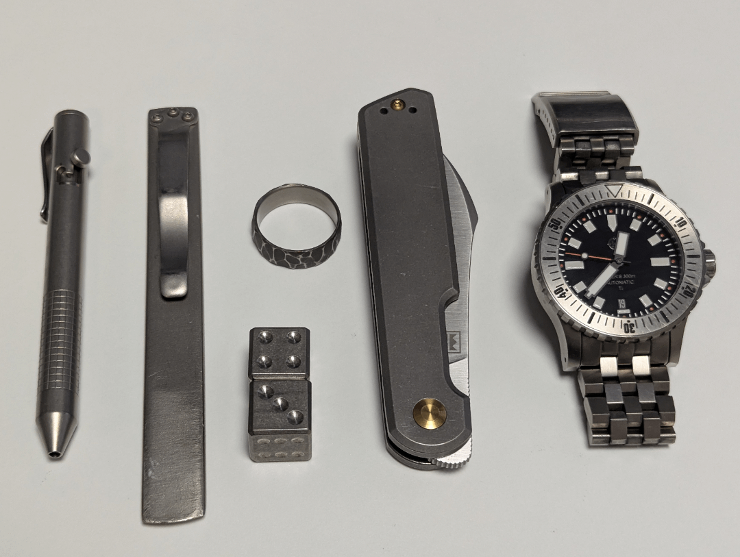In EDC Titanium kind of day December 19, 2025 Mig ti bolt pen Diy titanium pry bar Ti wedding ring Diy titanium fiddle dice, magnetic Kingsford klipper Helm Vanuatu titanium by drphilthy_2469 EDC Prev Post The M21K is here! December 19, 2025 Next Post Belt pouch December 19, 2025 Related Posts New EDC pistol January 15, 2026 My edc as a 15-year-old in Idaho January 15, 2026 My anti-doom scroller January 15, 2026 1 Comment AutoModerator 4 weeks ago Thank you for posting to r/EDC! Include a detailed item list (make/model) within **1 hour** of submission. Lists can go in the title, a comment, or the image. Posts without lists will be removed. If you have already provided a list, not further action is needed, thanks | [FAQ](https://www.reddit.com/r/EDC/wiki/faq)*I am a bot, and this action was performed automatically. Please [contact the moderators of this subreddit](/message/compose/?to=/r/EDC) if you have any questions or concerns.*Write A CommentYou must be logged in to post a comment.