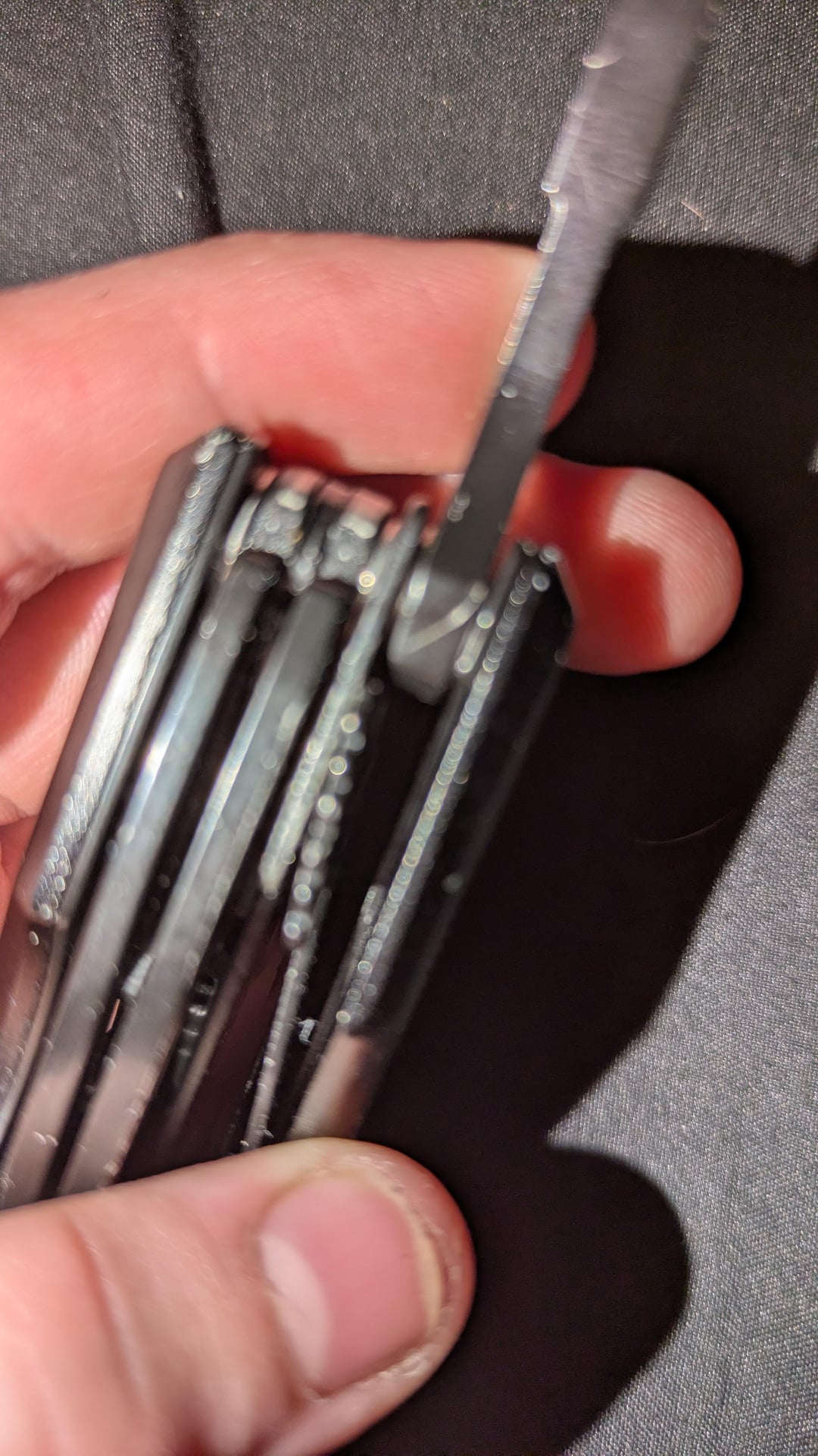 On it for each of the parts there's a little tab that you push to the side to let it go back in but when I opened the screwdriver part for it, and the tablet all the way to the​ side, got stuck, and now the screwdriver tip is stuck out because I can't put it back, does anyone know how I can fix this without damaging it?