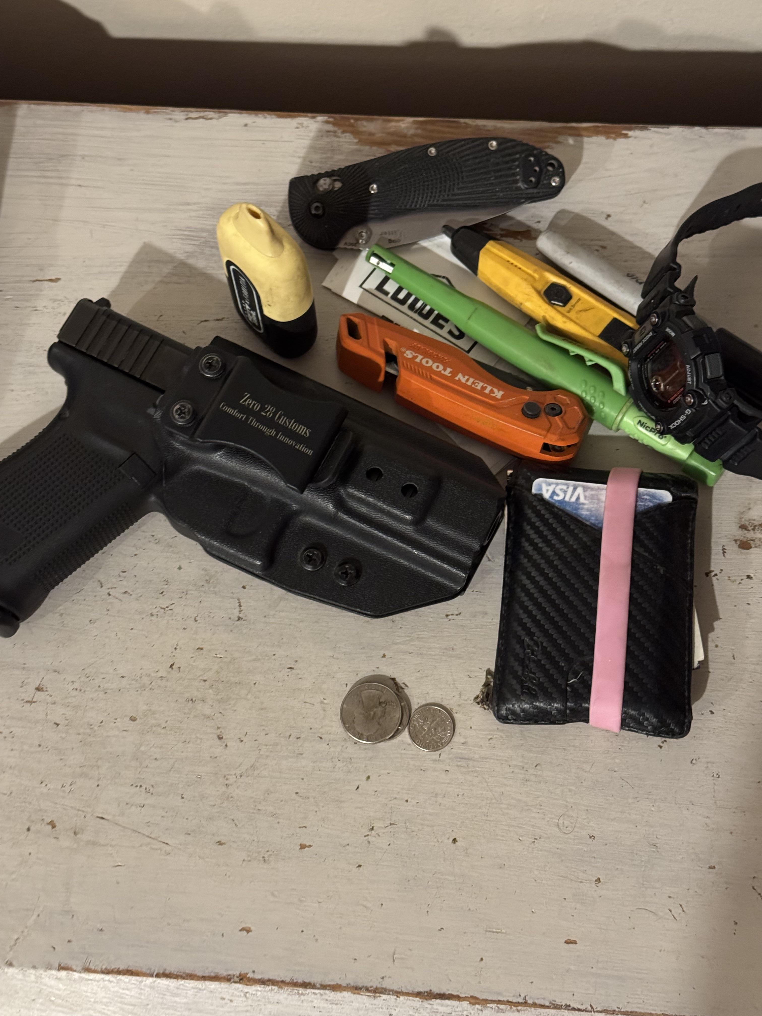 Klein razor knife, Ritter/Hogue RSK full size, GW7900 casio, Glock 20.5, sharpie, voltage tester,off brand mechanical pencil…..