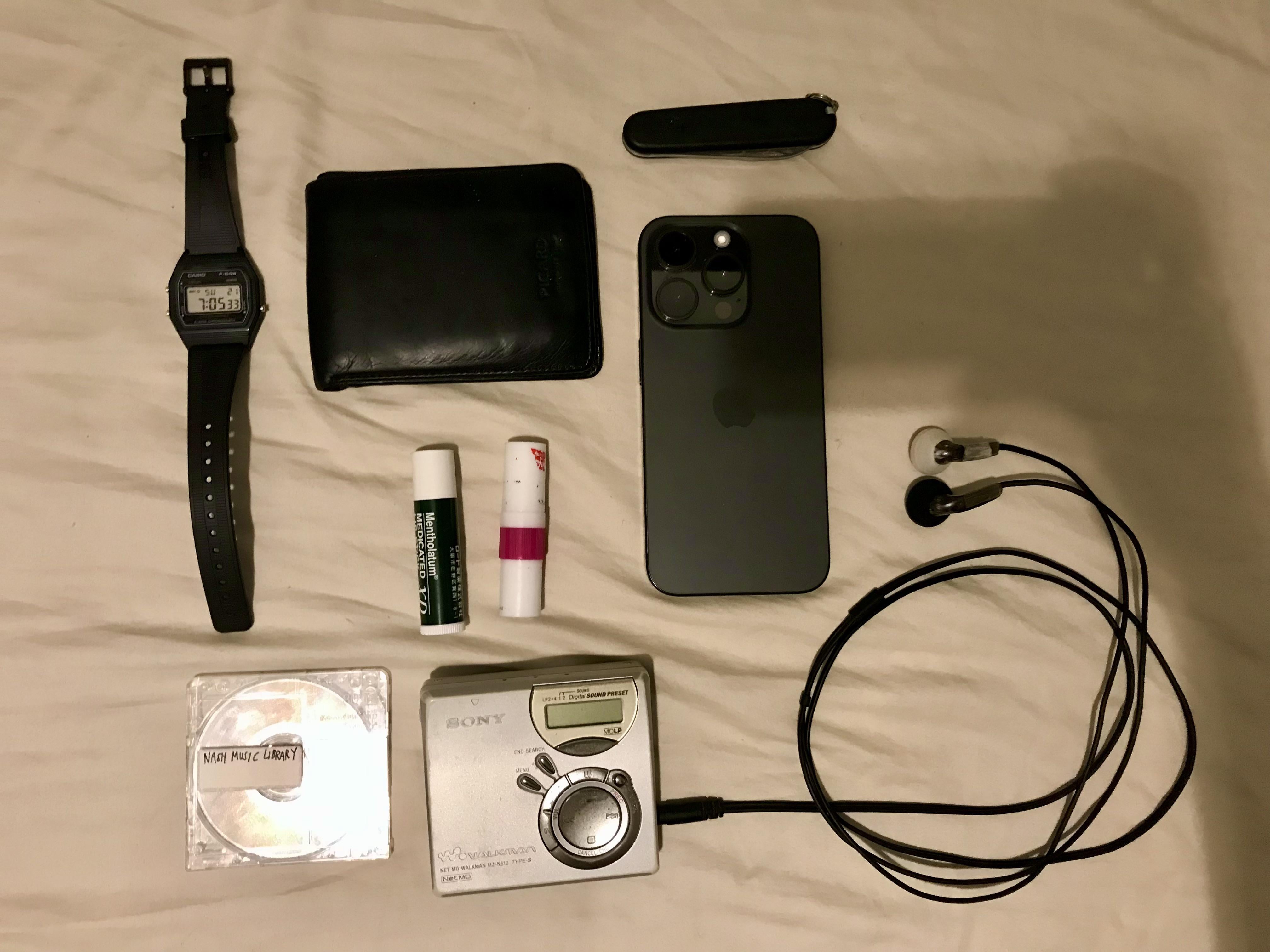 nothingleftbutfaith 4 weeks ago Casio F-84W digital watchOld Picard slim walletVictorinox Ecoline Bantam SAKiPhone 15 ProChapstickPoy Sian Mark II inhalerSony Neige 80min recordable MiniDiscSony MZ-N510 portable NetMD recorderVenture Electronics Monk earphones
