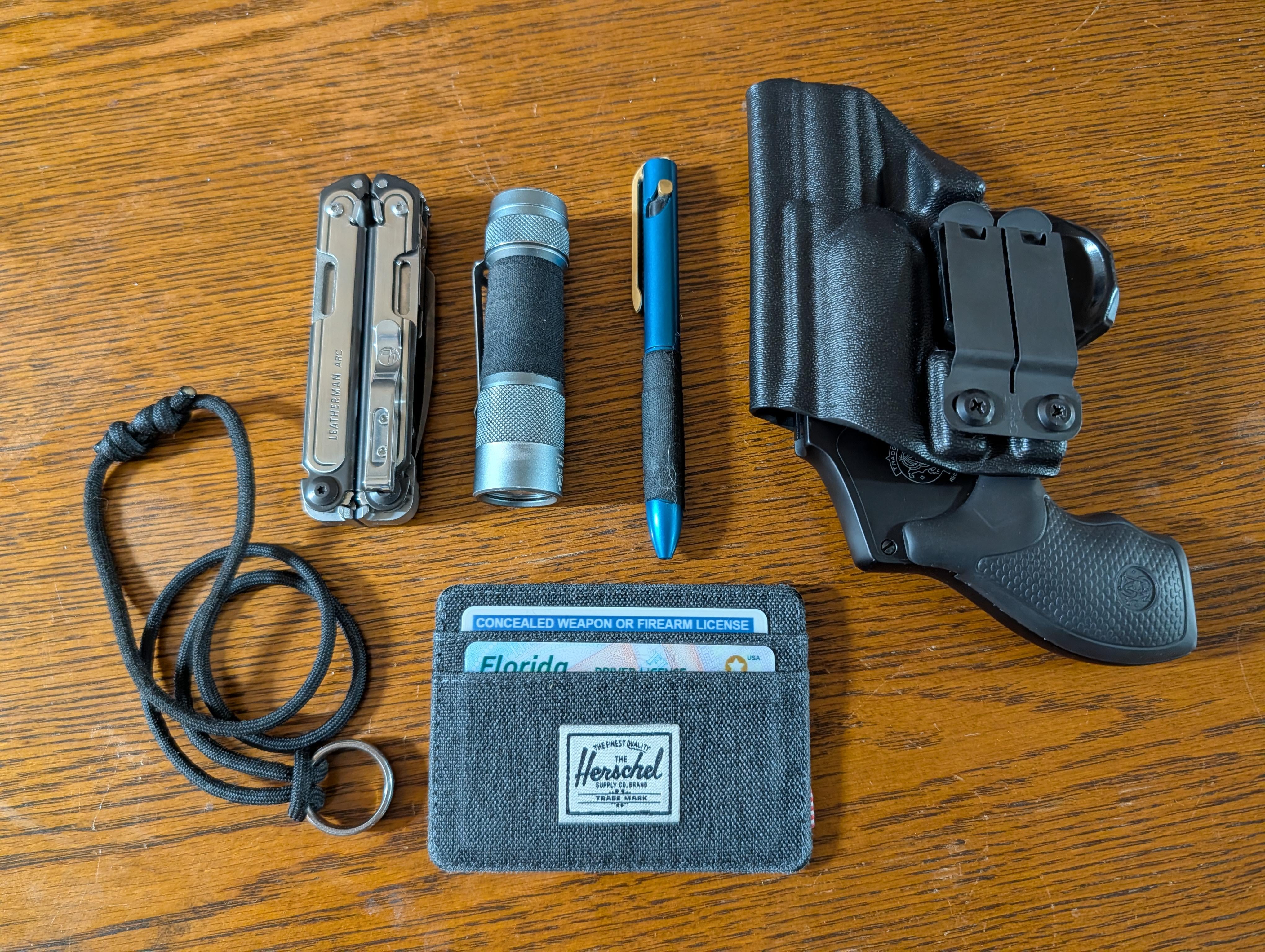 In EDC My EDC December 21, 2025 Leatherman ArcLumintop FW3AKaras Kustoms Modal in Prospector finishS&W 442 in Harry's Holsters Icon 2.0Herschel Charlie walletRing my dad made when I was in high school with an adjustable Paracord necklace I made by silverballer EDC Prev Post Got Rag? Let’s see it, I’ll show mine if you show yours. December 21, 2025 Next Post Does anyone know if there’s a way to re-point it? I’m currently trying to sharpen it with a sharpening stone, but I don’t want to waste time. December 21, 2025 Related Posts My first Spyderco January 15, 2026 Early Birthday Present from my wife and daughter January 15, 2026 Jan 2026 EDC January 15, 2026 2 Comments AutoModerator 4 weeks ago Thank you for posting to r/EDC! Include a detailed item list (make/model) within **1 hour** of submission. Lists can go in the title, a comment, or the image. Posts without lists will be removed. If you have already provided a list, not further action is needed, thanks | [FAQ](https://www.reddit.com/r/EDC/wiki/faq)*I am a bot, and this action was performed automatically. Please [contact the moderators of this subreddit](/message/compose/?to=/r/EDC) if you have any questions or concerns.* Longjumping_Drag_159 4 weeks ago Florida man is friendWrite A CommentYou must be logged in to post a comment.