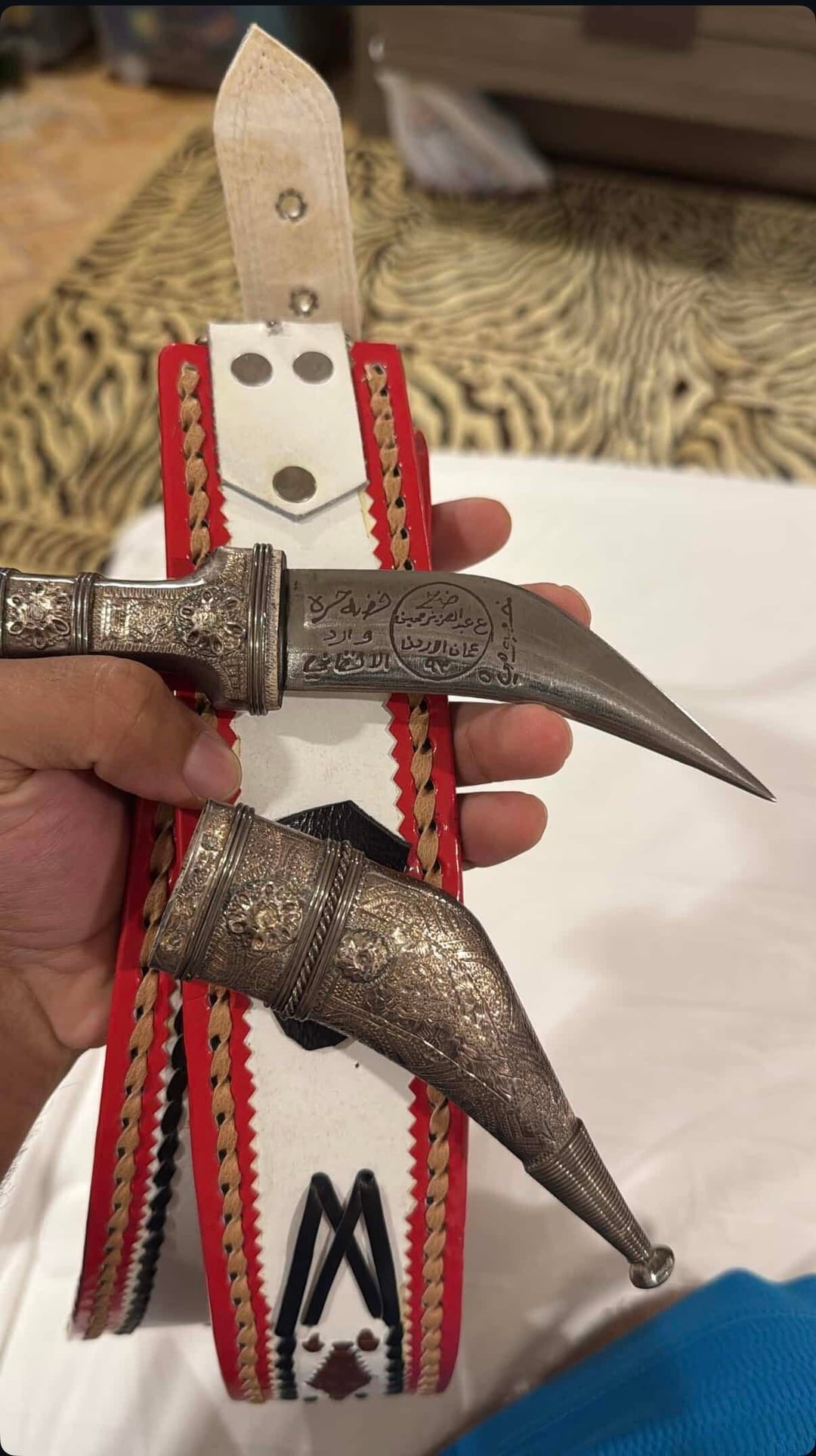 This particular dagger was made in Amman, Jordan by the family محيسن “mohaissen” which are a well known family that make these daggers, and are considered the best in this craft. They are very popular among bedouins in northern Saudi Arabia and southern Jordan. This particular dagger has the date on it, at 1993, and the name of the maker.