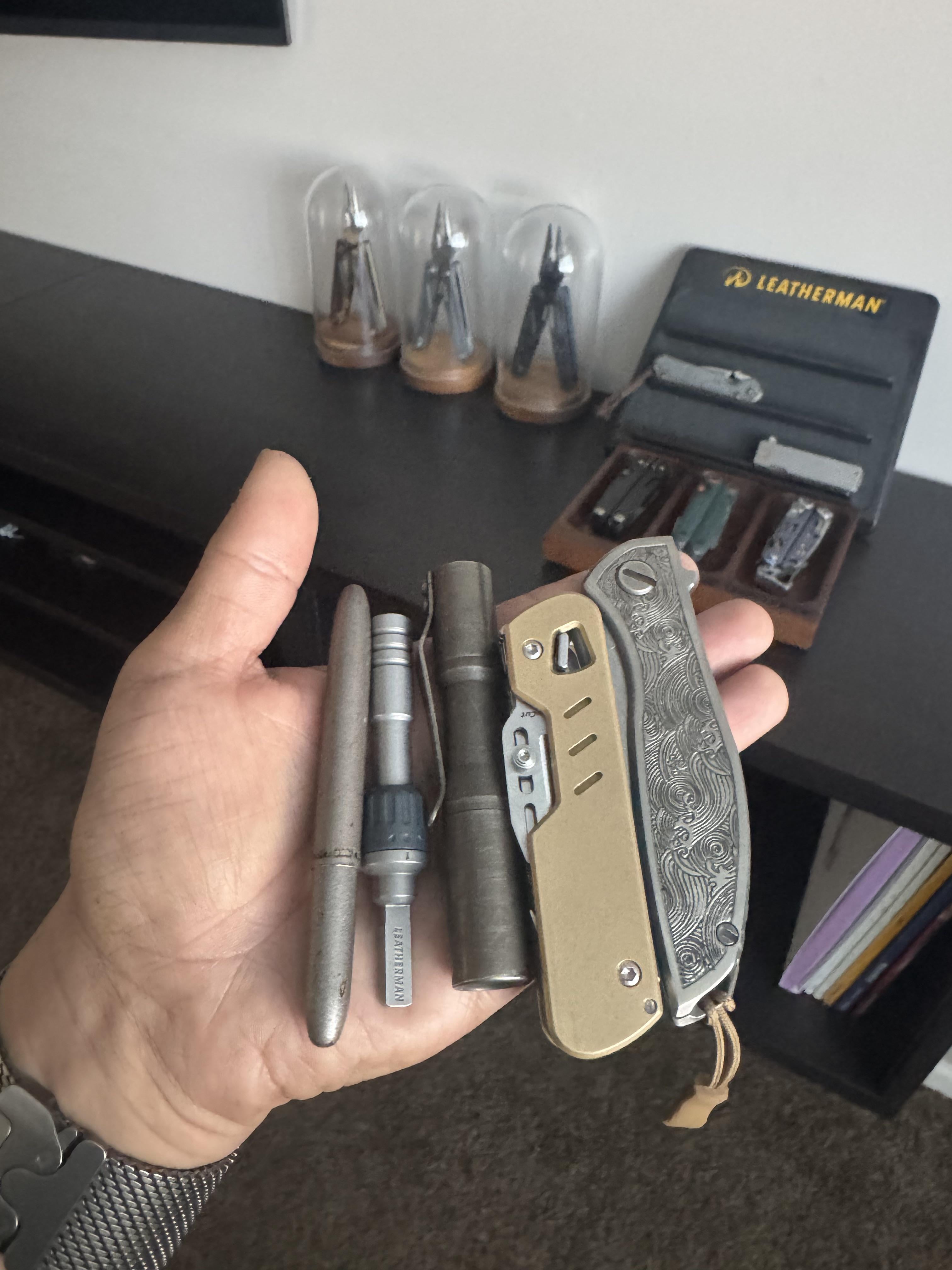 NearlySilentObserver 4 weeks ago – diplomat spacetec pen– Leatherman ratchet extender– CWF Micro Arcadian– customized Leatherman T4– Shirogorov Neon Zero– Apple Watch Ultra 2
