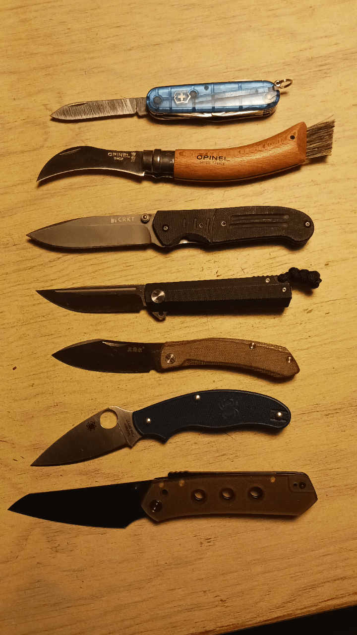 Victorinox (idk what model), Opinel No. 8 Mushroom knife, CRKT Ignitor T, BΓΆker Cataclyst 42a, Sanrenmu 7315, Spyderco Ukpk, Civivi Vision FG