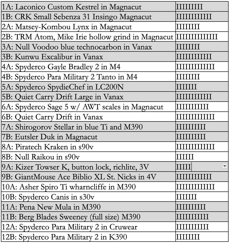 Hello fellow knife enthusiasts! Several days ago I posted 12 pairs of knives with similar characteristics within each pair. Characteristics include one or more of the following: blade steel, blade geometry, ergonomics, aesthetics, locking mechanism, overall size, price point, intended purpose, or overall functional capacity or practicality in a folding knife.