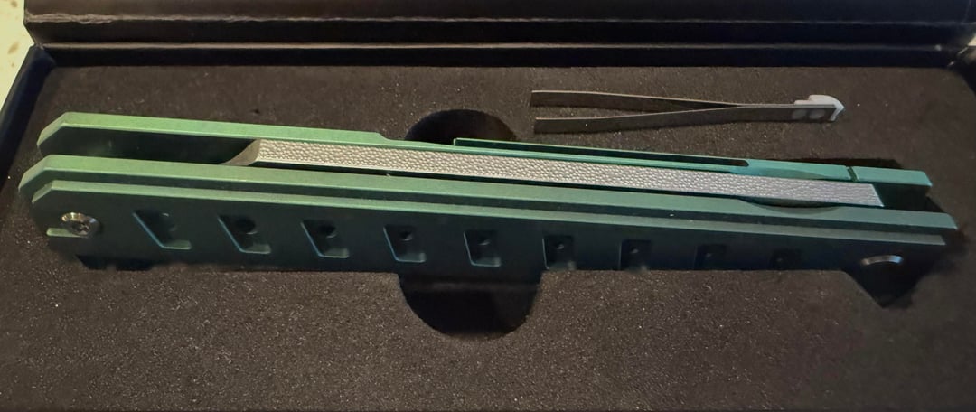 Initial impressions are wow. The color looks fantastic in person (I was nervous about getting the anodized) the action and ball detents work fantastically, the noise is bliss. Blade is super sharp out of the box, belt clip feels exceptionally solid and overall look is killer. Tweezers are a nice touch, and the file texture on the back of the blade is one of my favorite features visually.