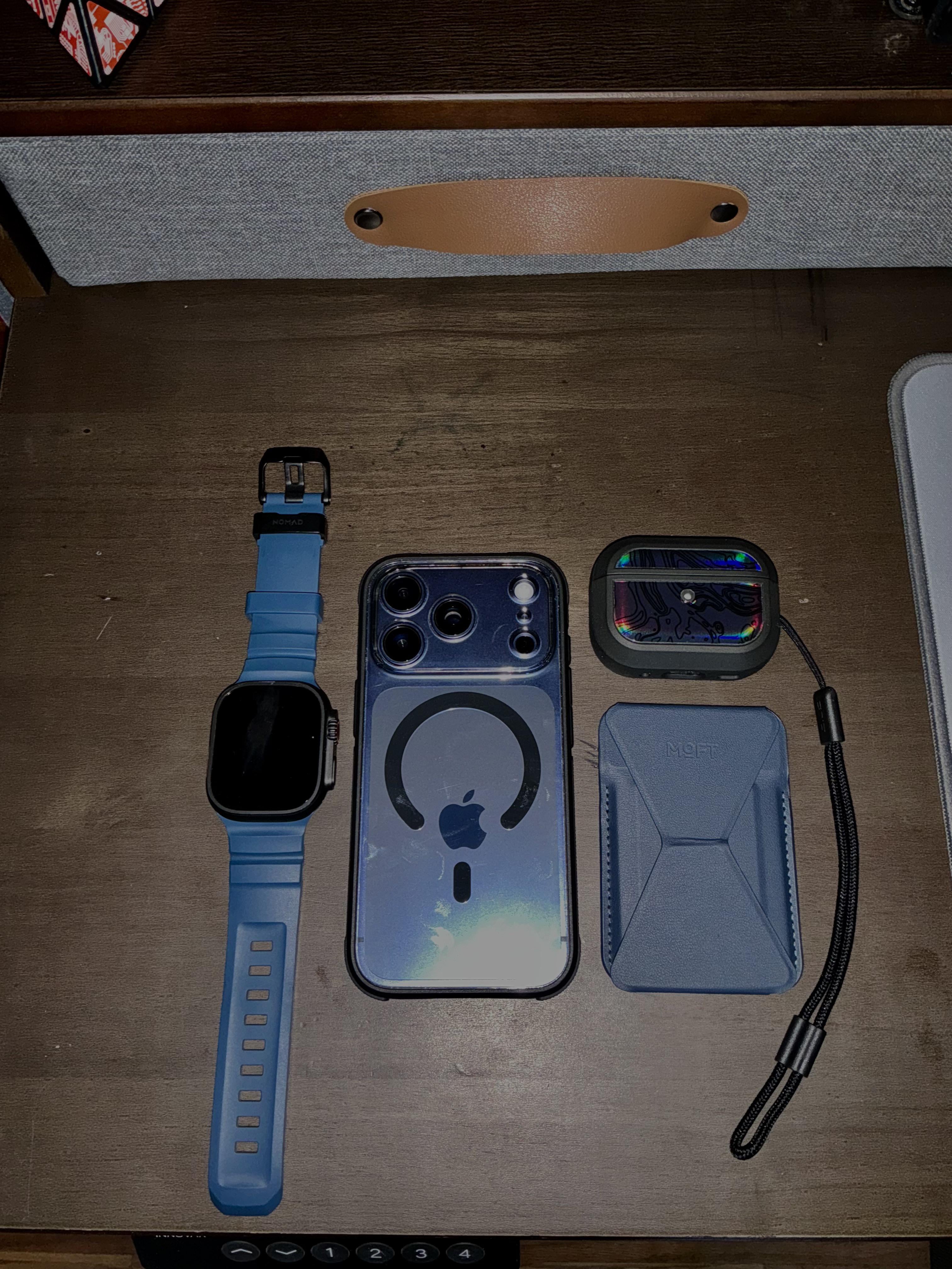 My Apple Watch Ultra with Atlantic blue Rocky Point band, iPhone 17 Pro in the dbrand Ghost case, navy blue Moft MagSafe wallet stand, and AirPods Pro 2 with dbrand grip case and Obsidian skin.